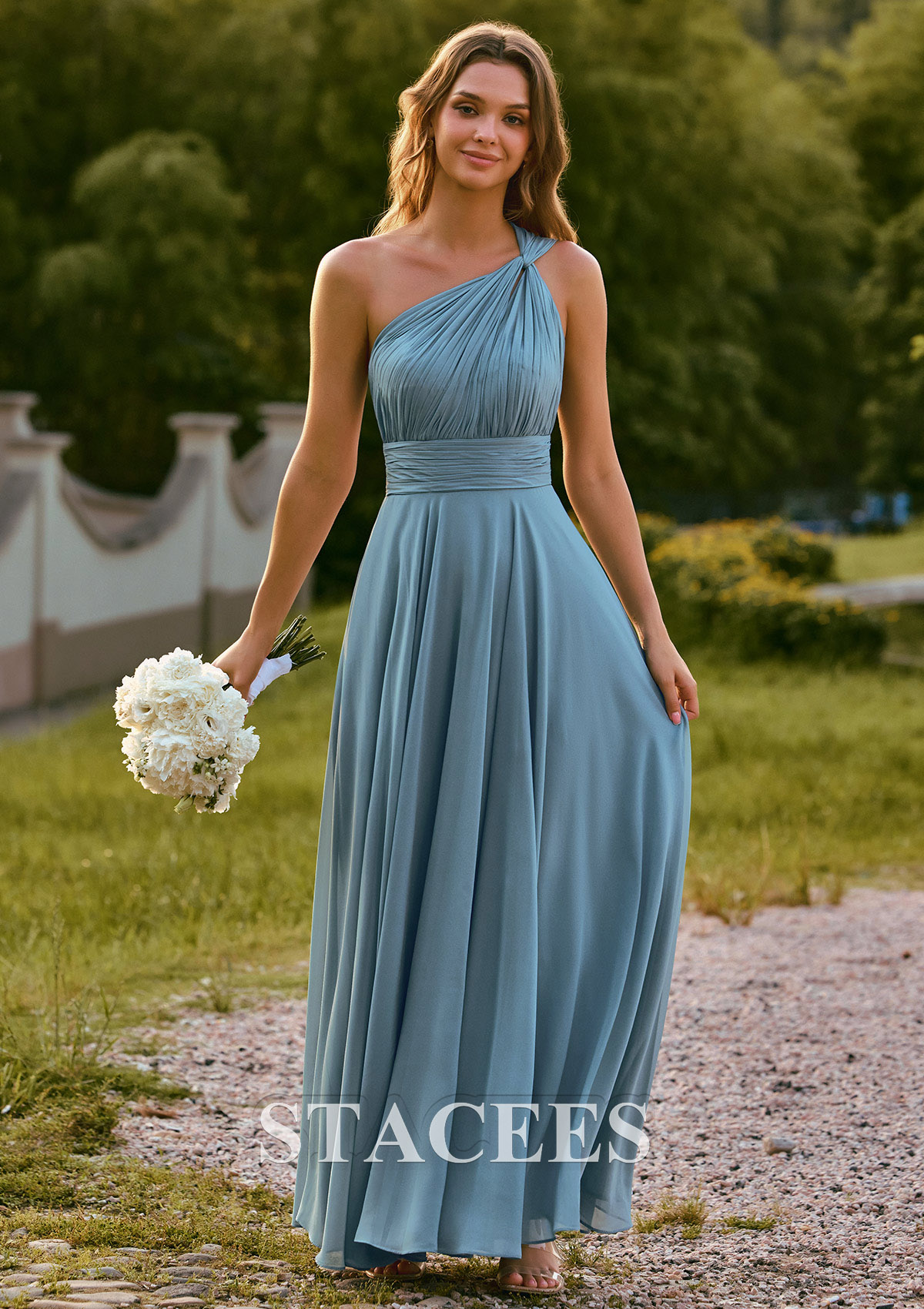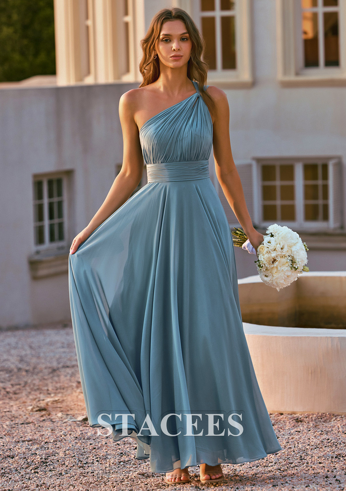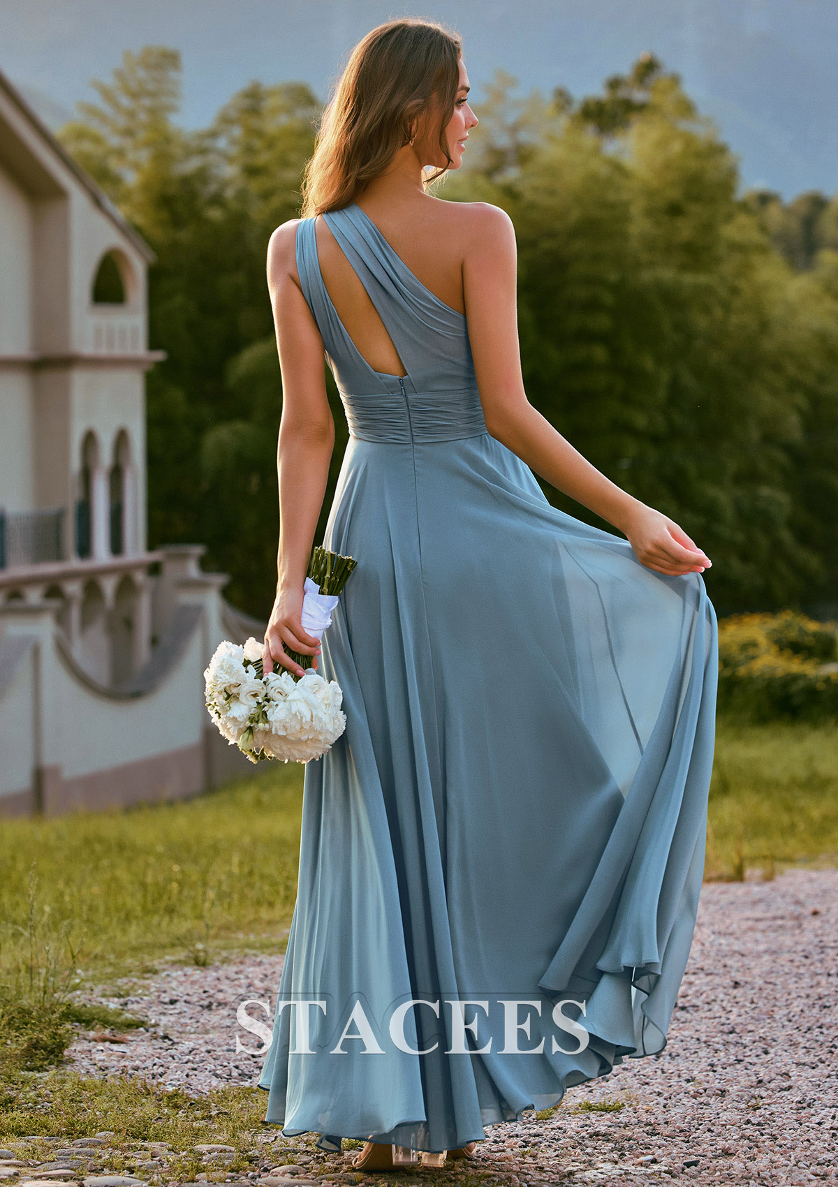 This bridesmaid dress adopts a one-shoulder design, with one shoulder strap across the body and a cross-cut element on the back, showing the back line, adding sexiness and fashion sense. The upper part is decorated with pleats, highlighting the layering, and the waist is tightened to highlight the curves; the skirt is wide and has a strong sense of drape, and the material is light, so it is elegant and agile when walking, just like a dancing butterfly.