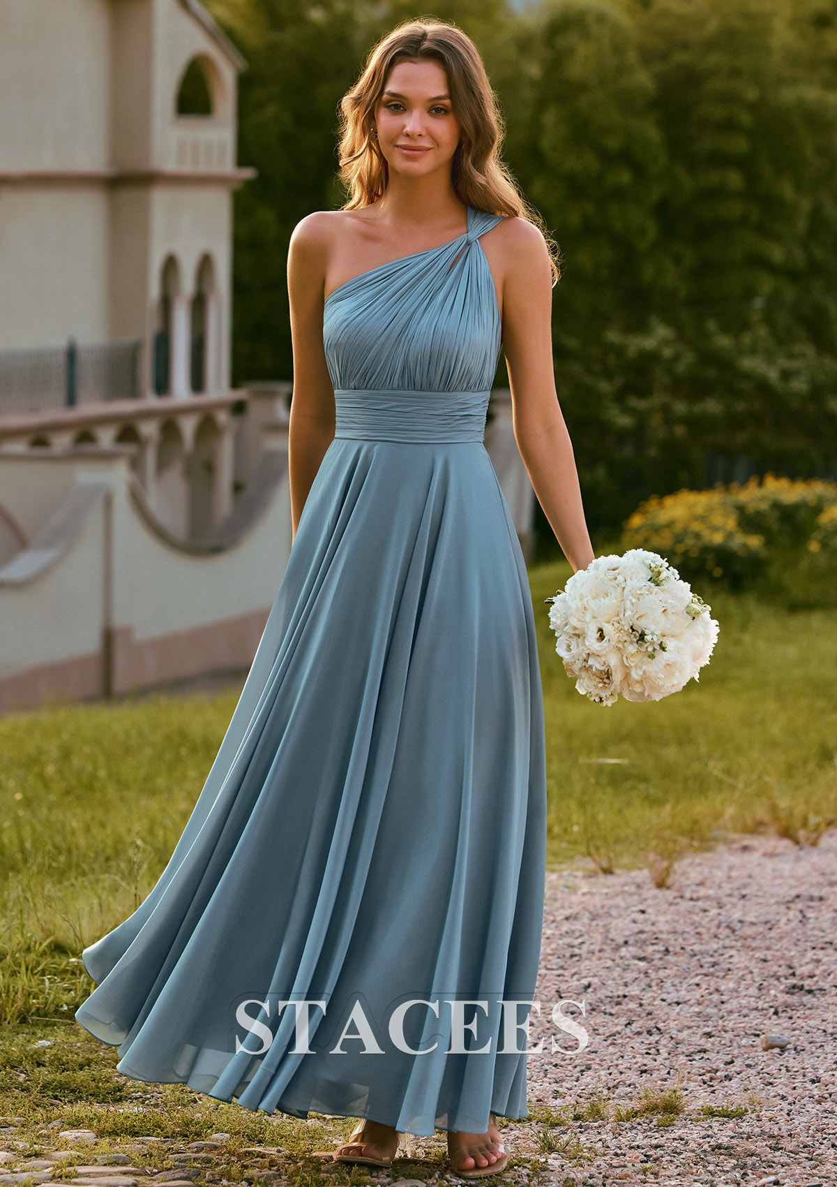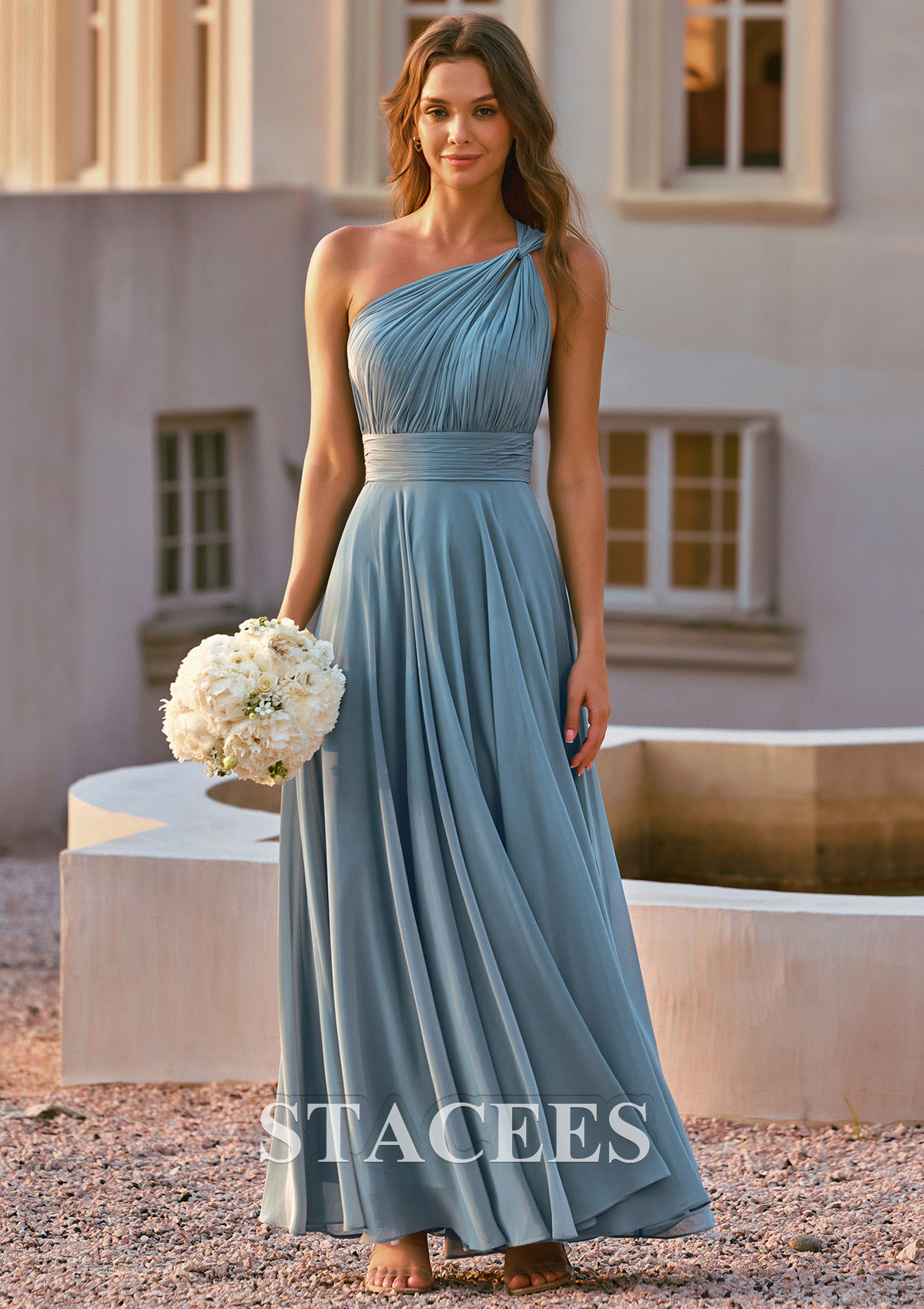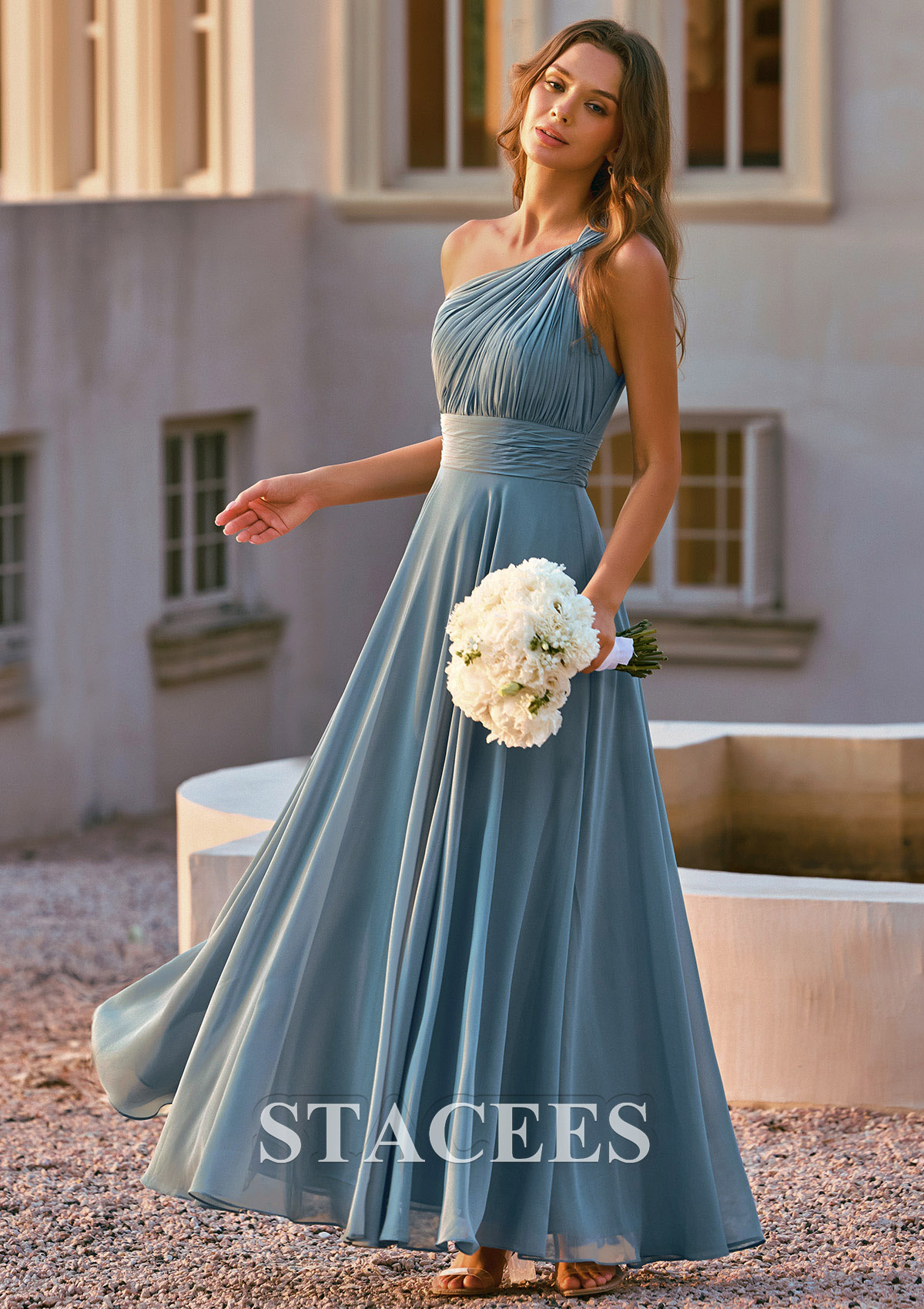 This bridesmaid dress adopts a one-shoulder design, with one shoulder strap across the body and a cross-cut element on the back, showing the back line, adding sexiness and fashion sense. The upper part is decorated with pleats, highlighting the layering, and the waist is tightened to highlight the curves; the skirt is wide and has a strong sense of drape, and the material is light, so it is elegant and agile when walking, just like a dancing butterfly.