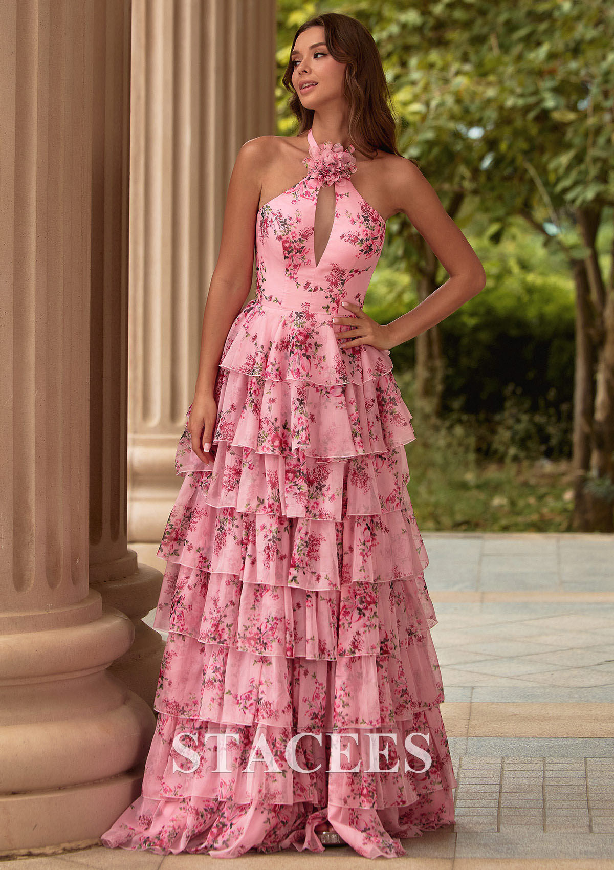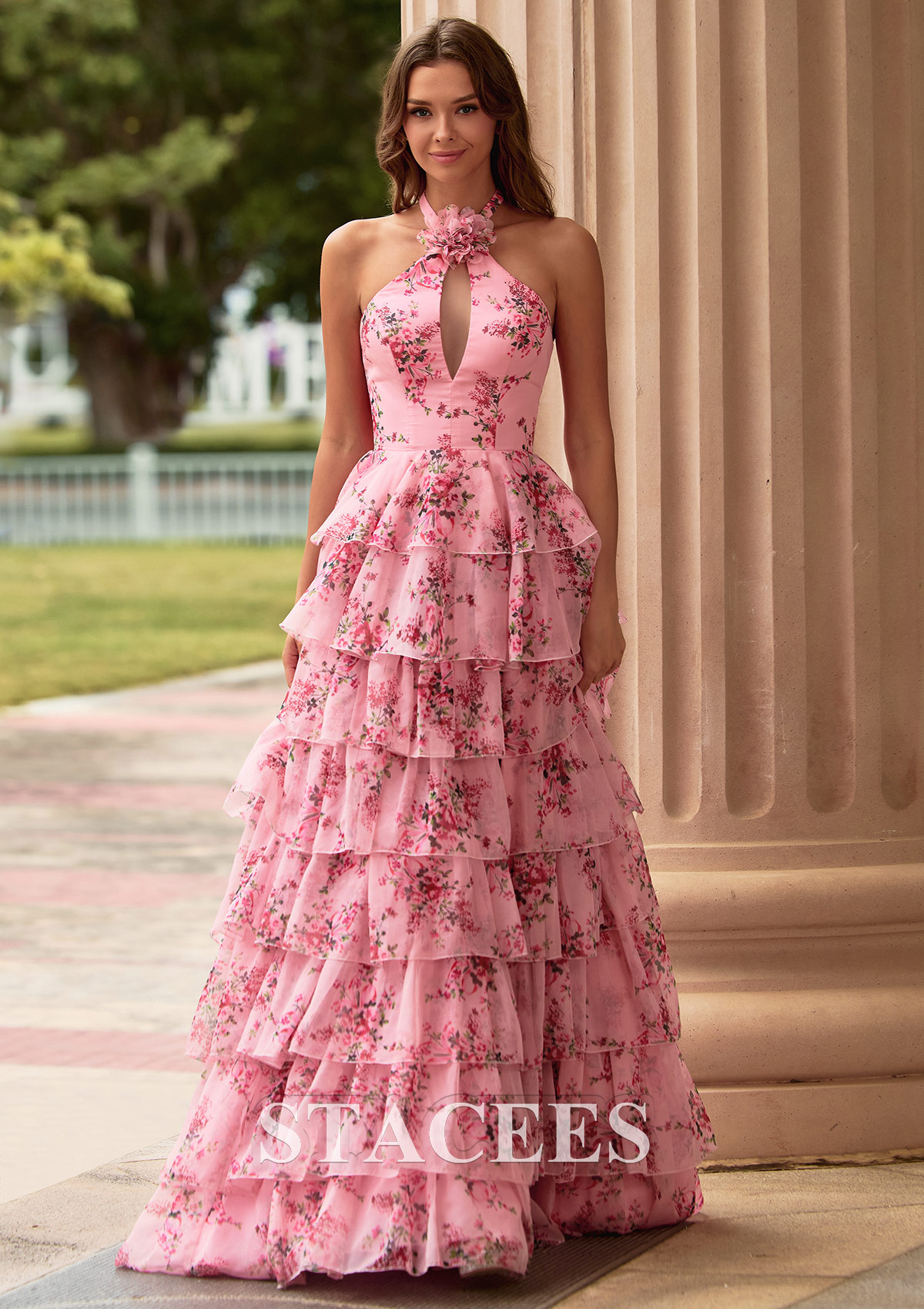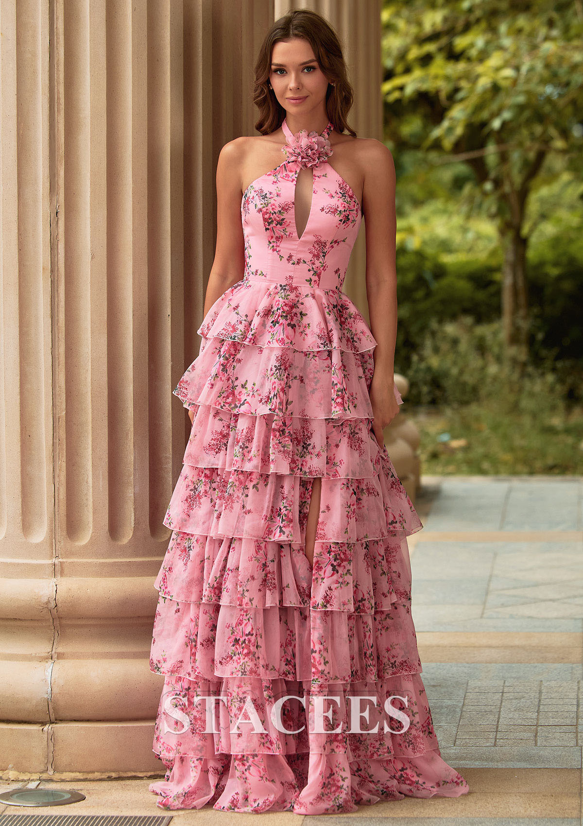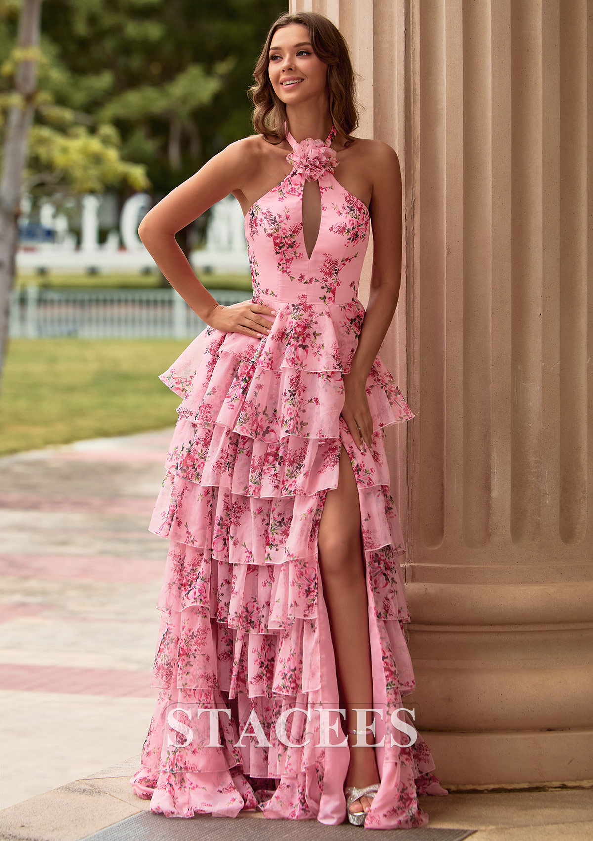 A-line Chiffon Prom Dress Halter Sweep Train with Flowers Ruffles Split Floral Print Keyhole S9046P - Prom Dresses - Stacees.co.uk