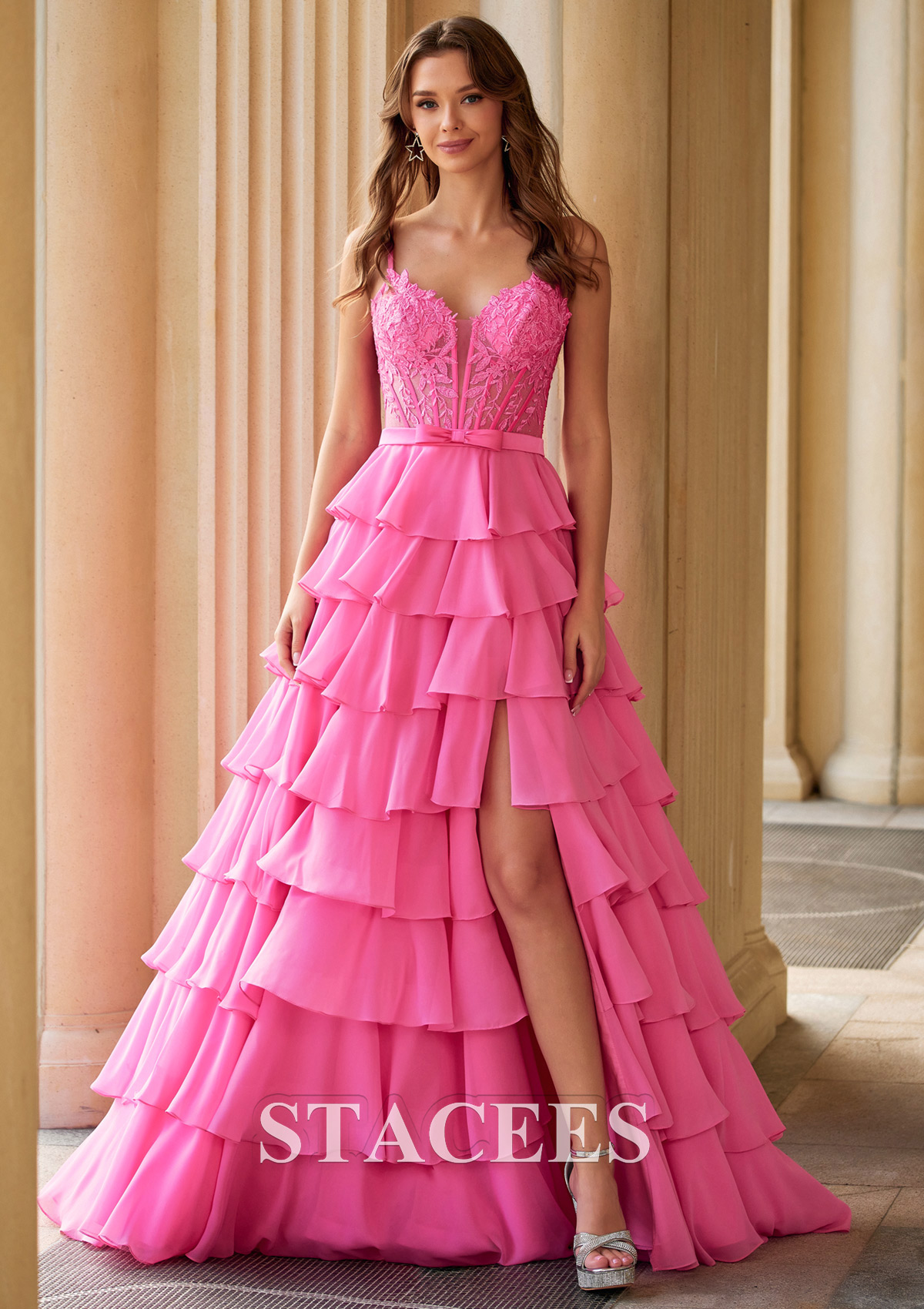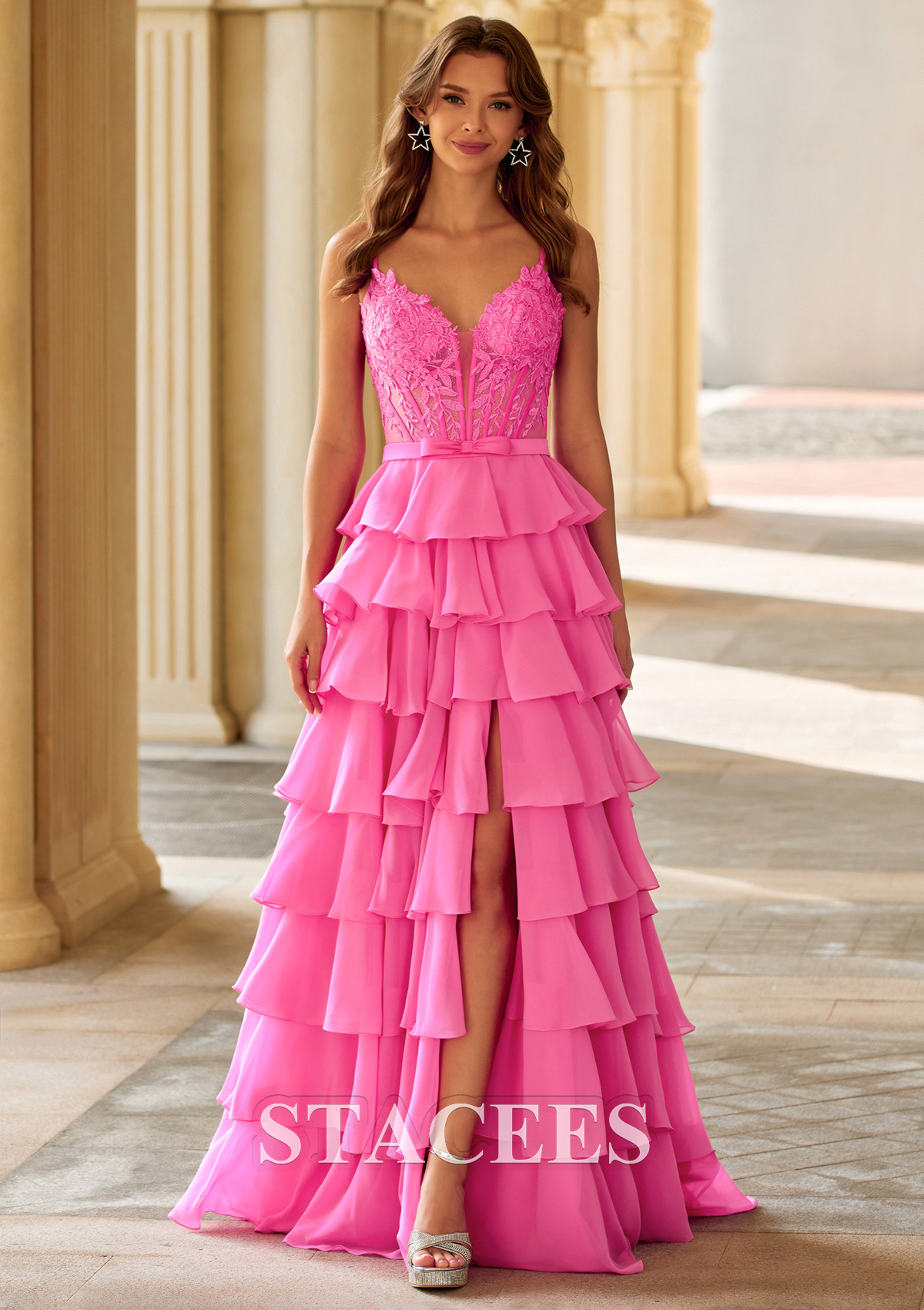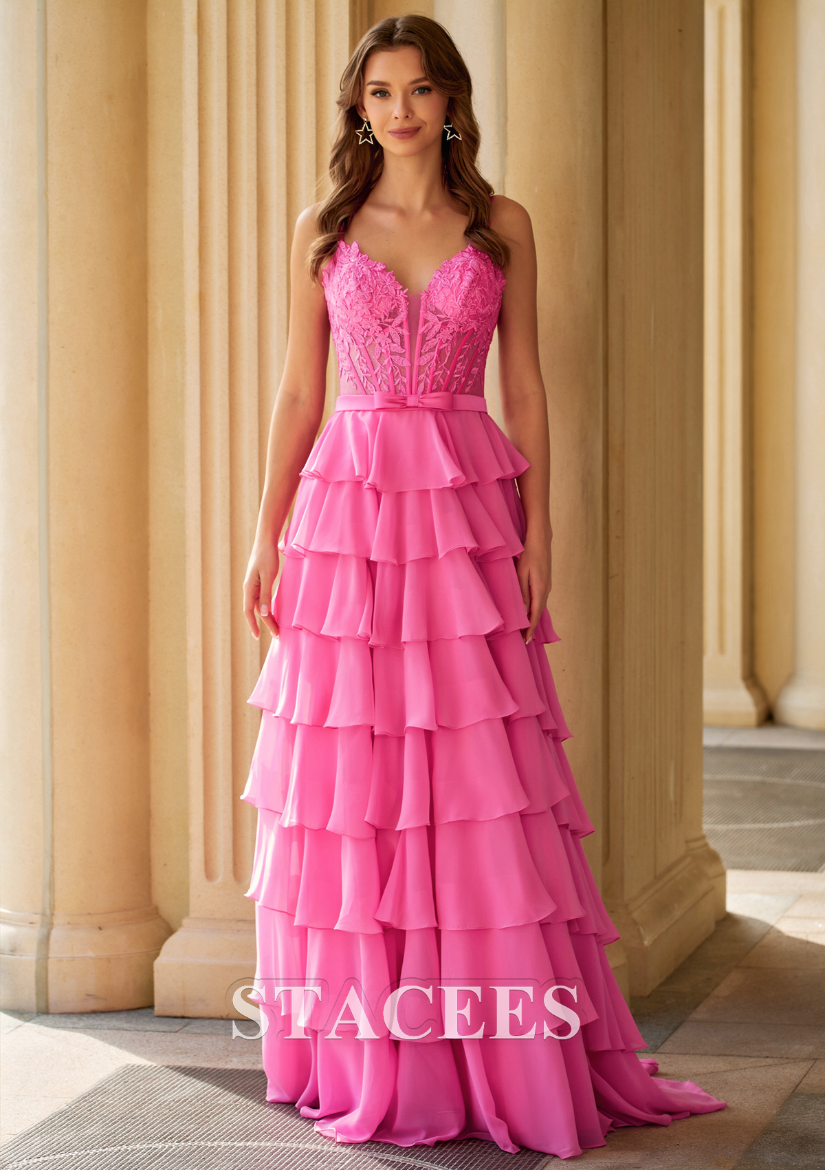 A-line Chiffon Prom Dress V Neck Floor-Length with Appliqued Beading Ruffles Split Bows S9045P - Prom Dresses - Stacees.co.uk