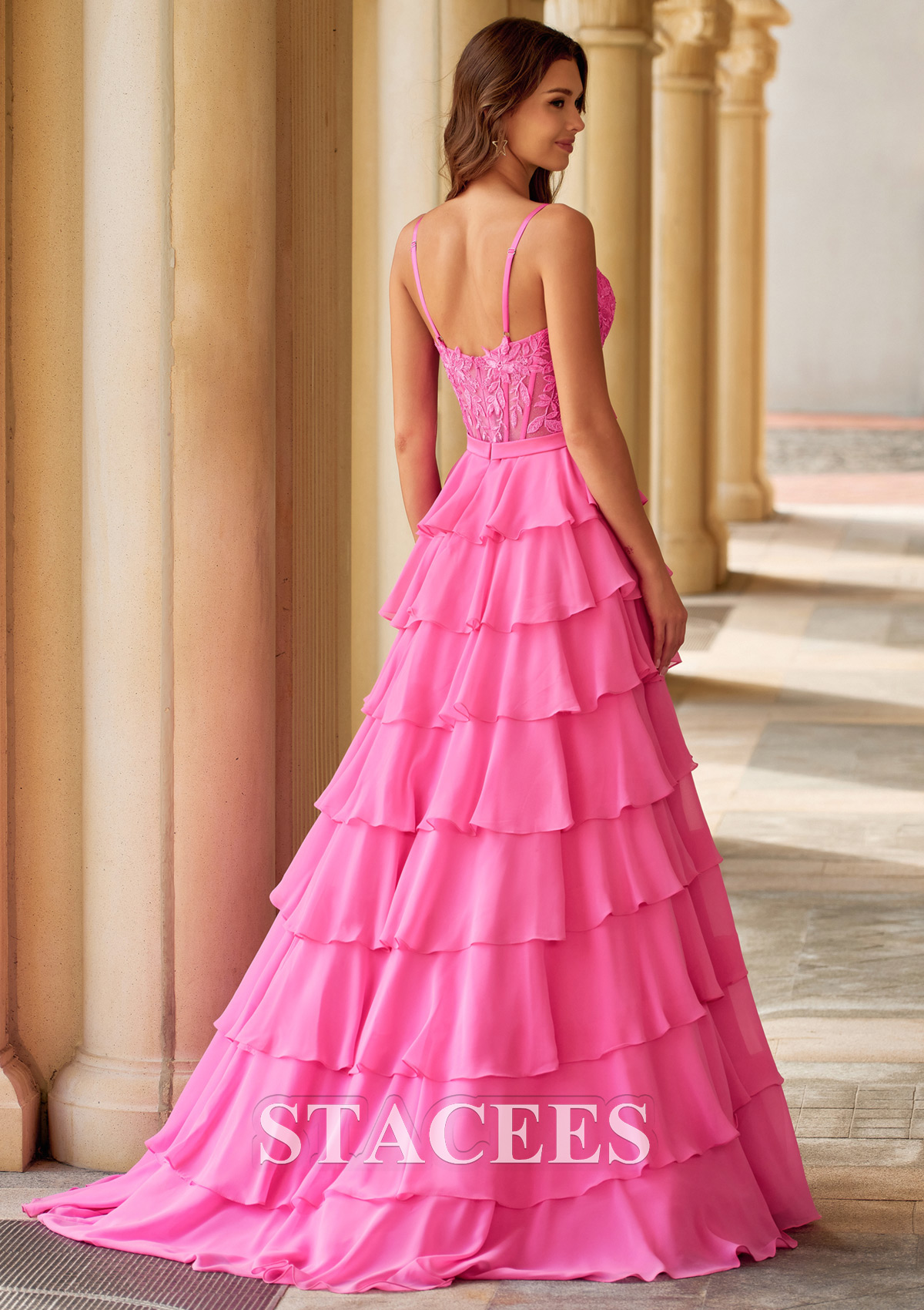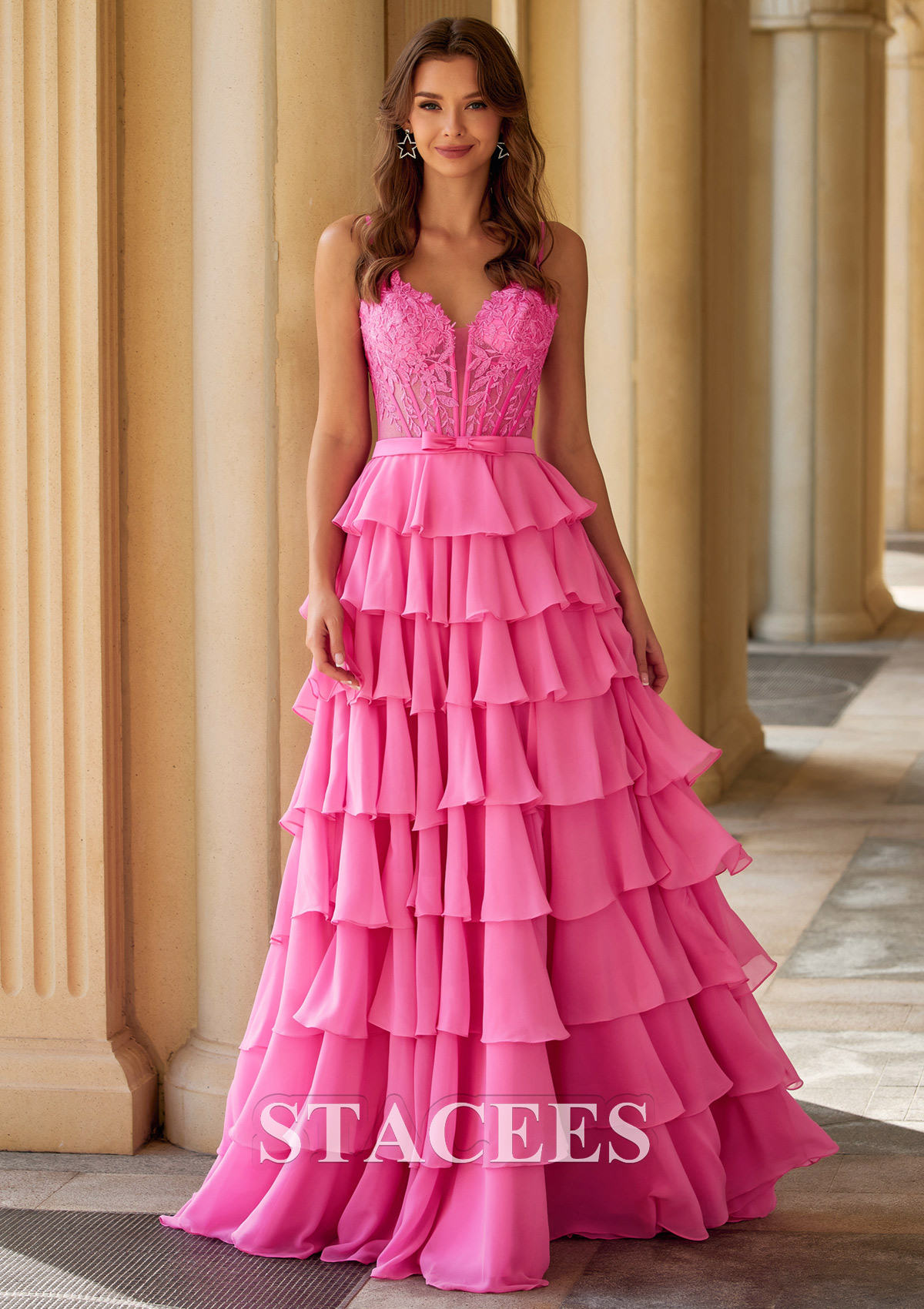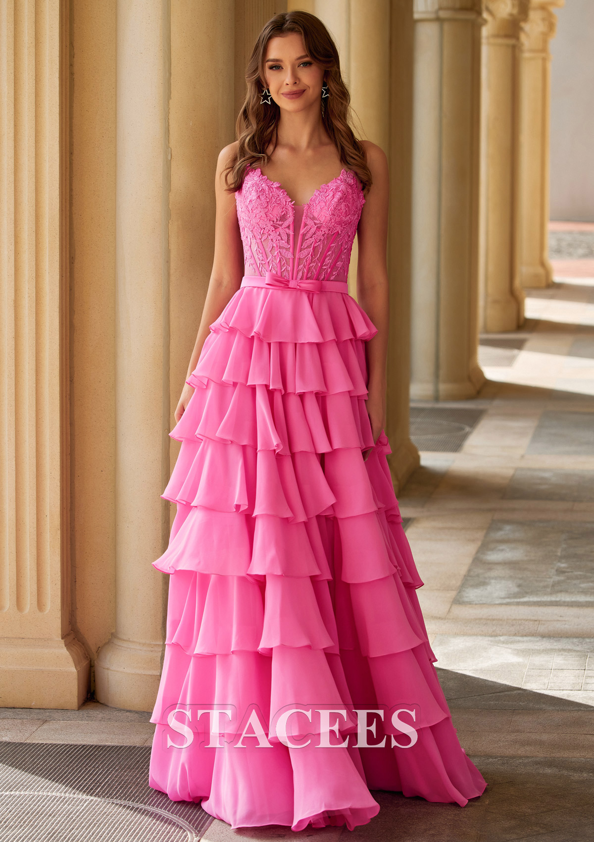 A-line Chiffon Prom Dress V Neck Floor-Length with Appliqued Beading Ruffles Split Bows S9045P - Prom Dresses - Stacees.co.uk
