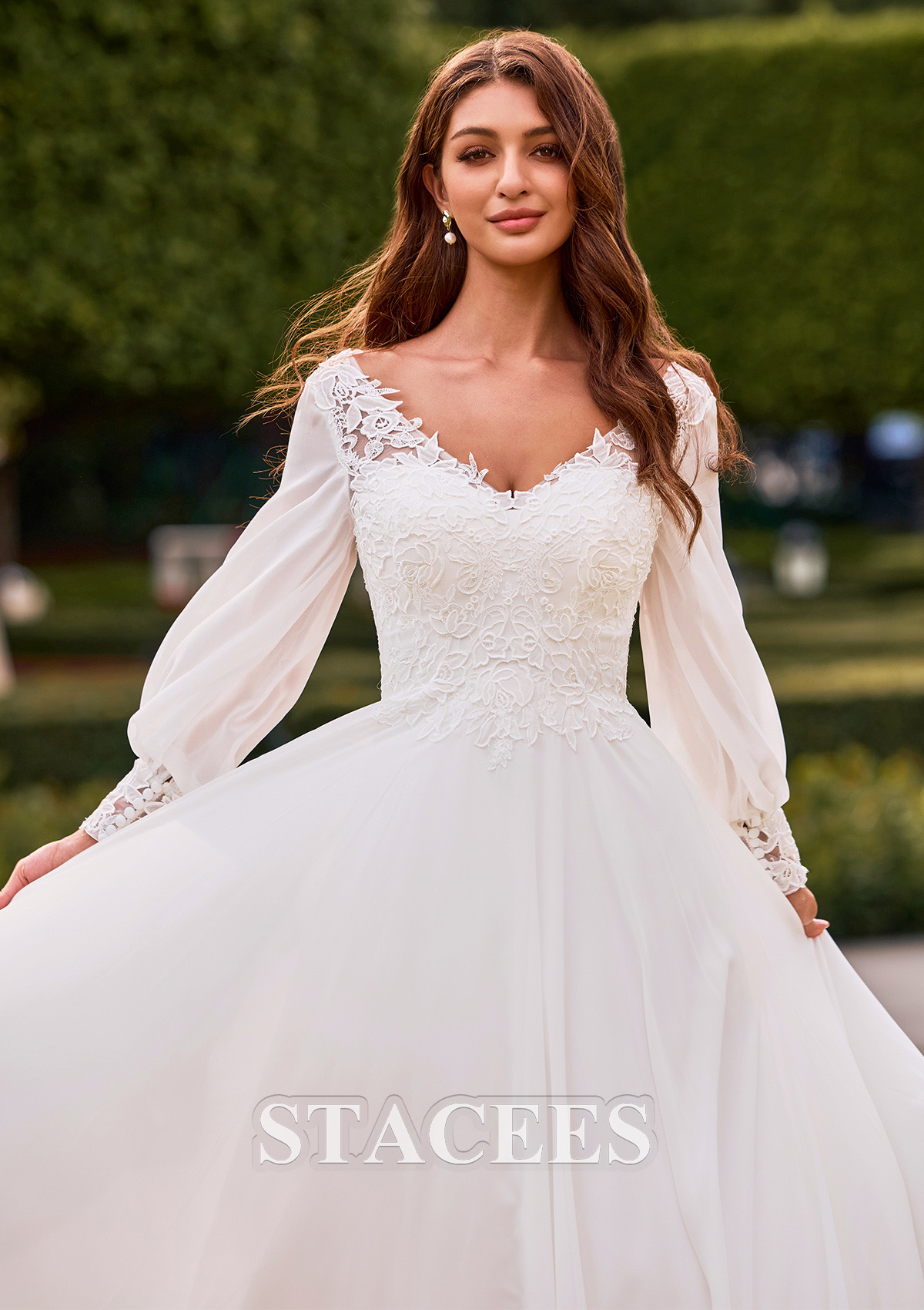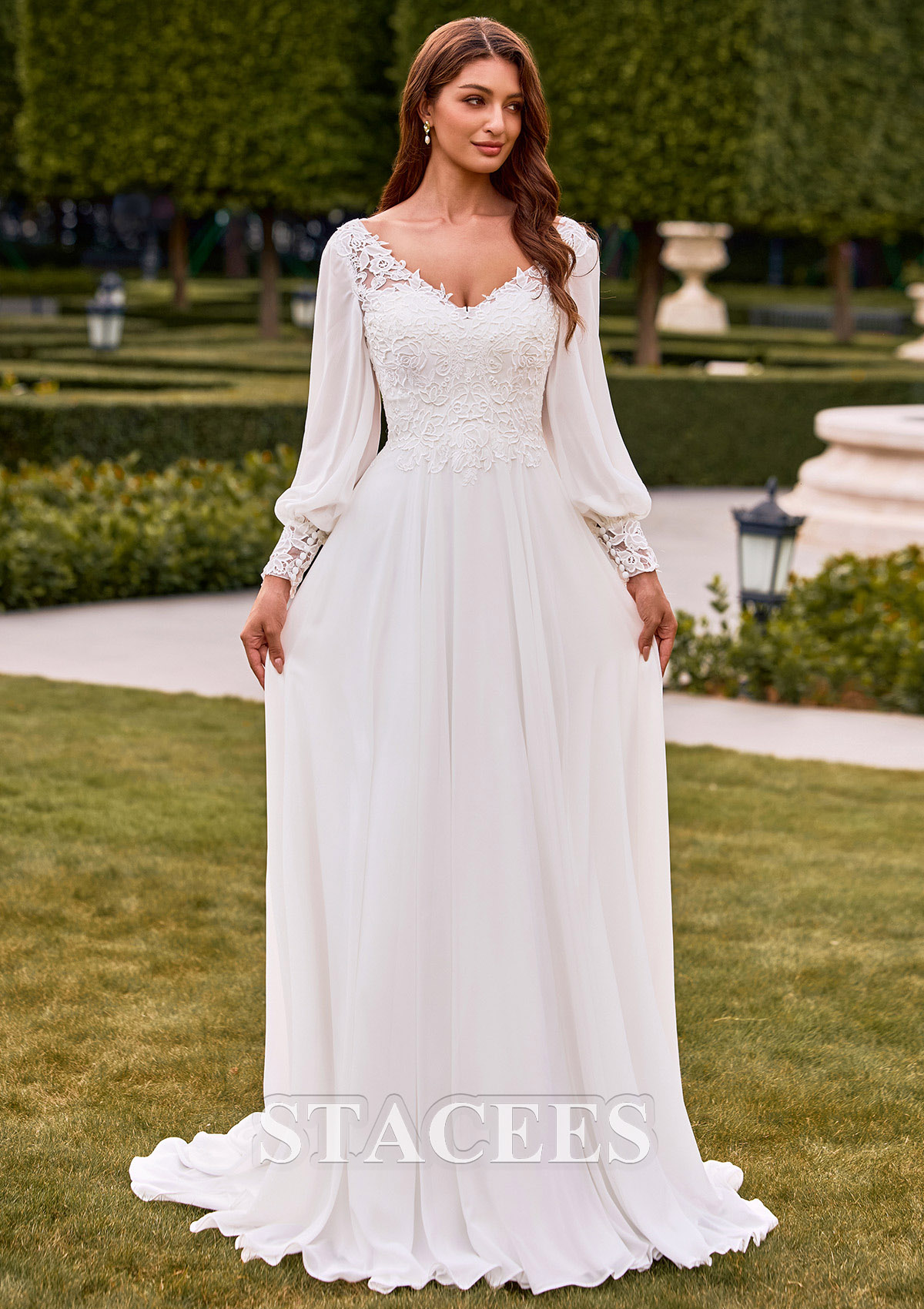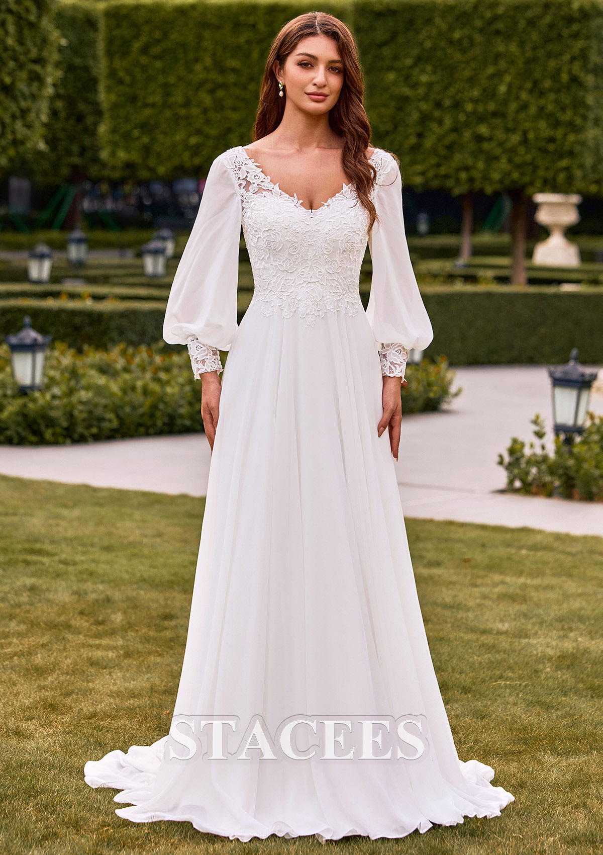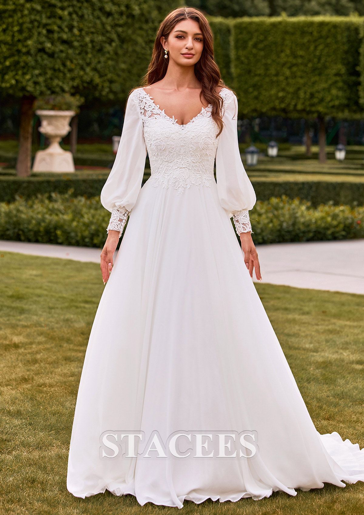 A-line Chiffon Wedding Dress V Neck Court Train with Lace S3166W - Wedding Dresses - Stacees.co.uk