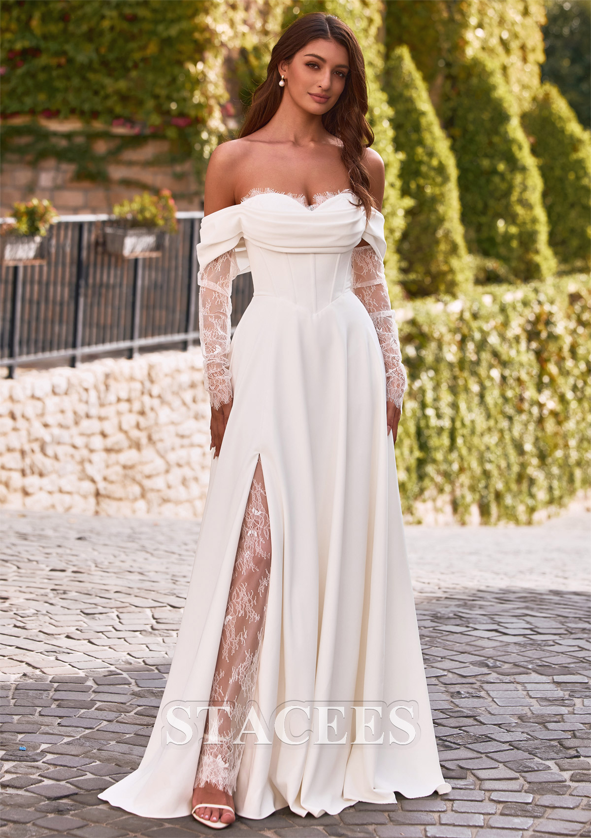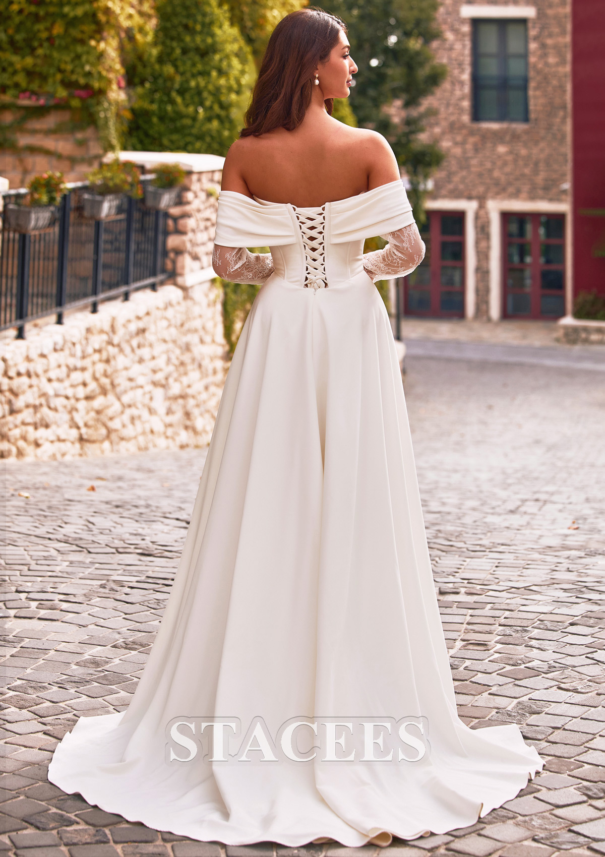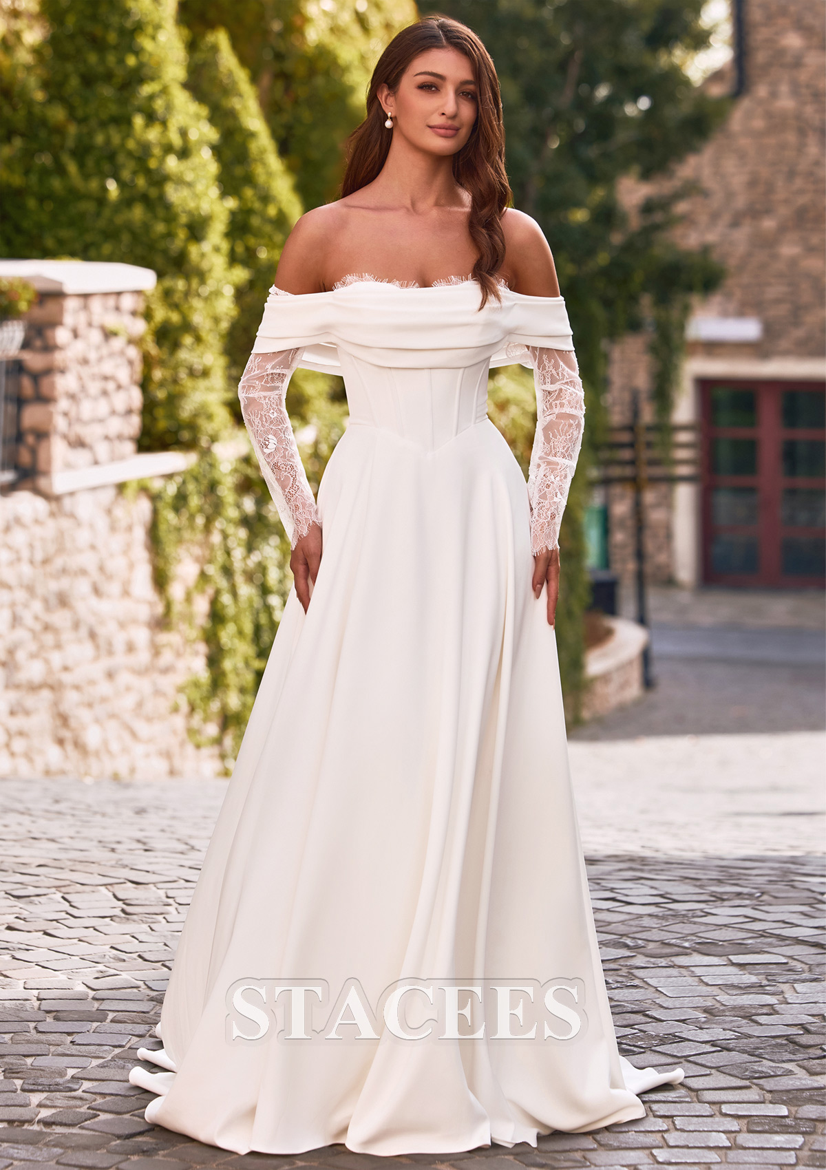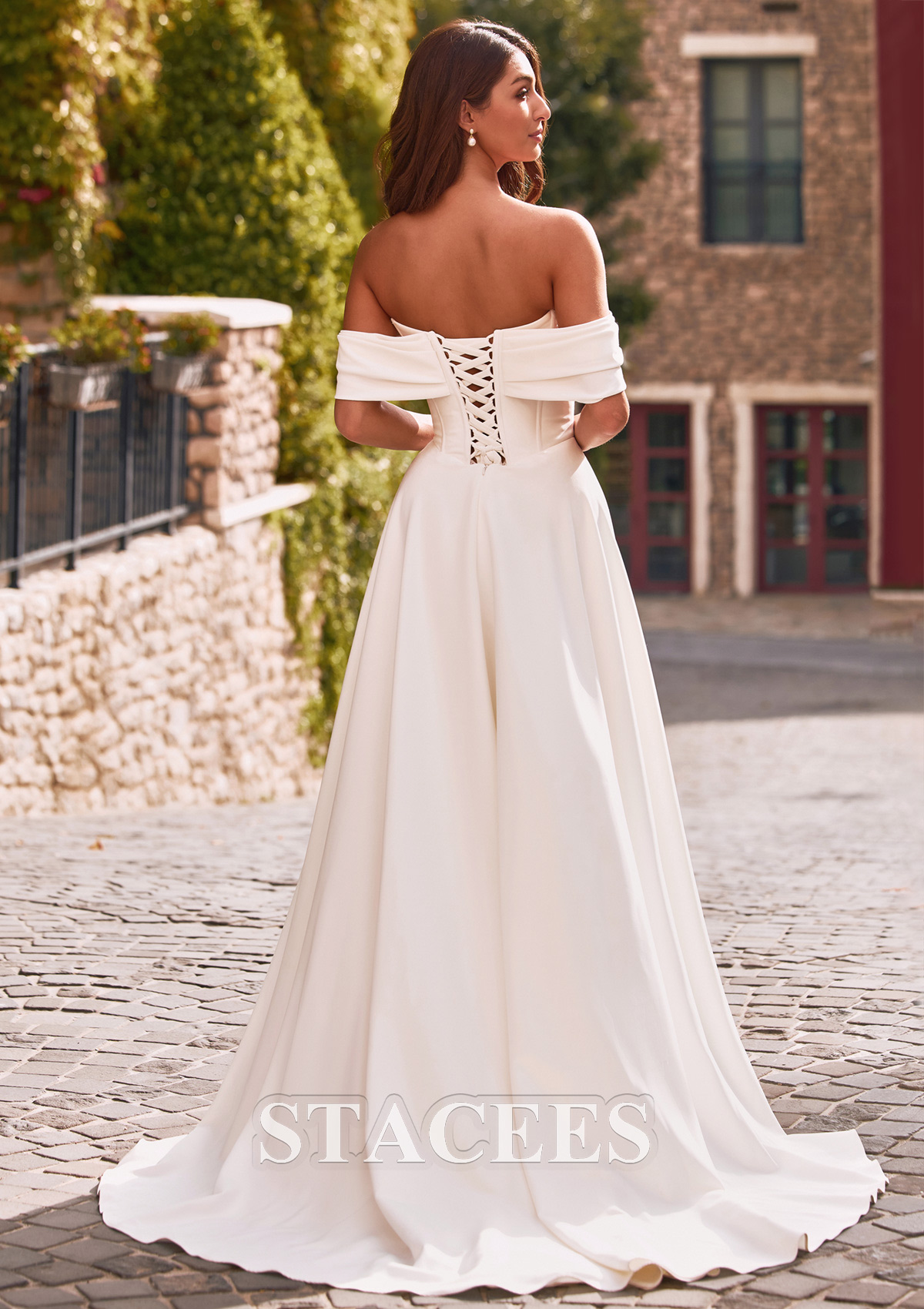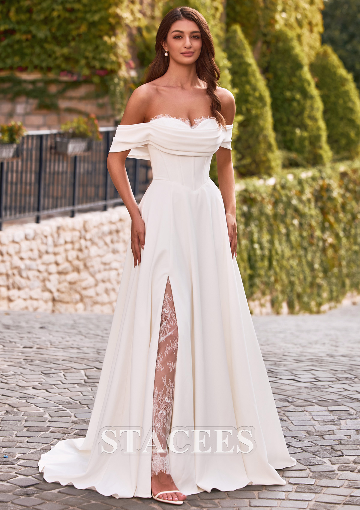 A-line Satin Wedding Dress Off-the-Shoulder Court Train with Lace Pleated S3161W - Wedding Dresses - Stacees.co.uk