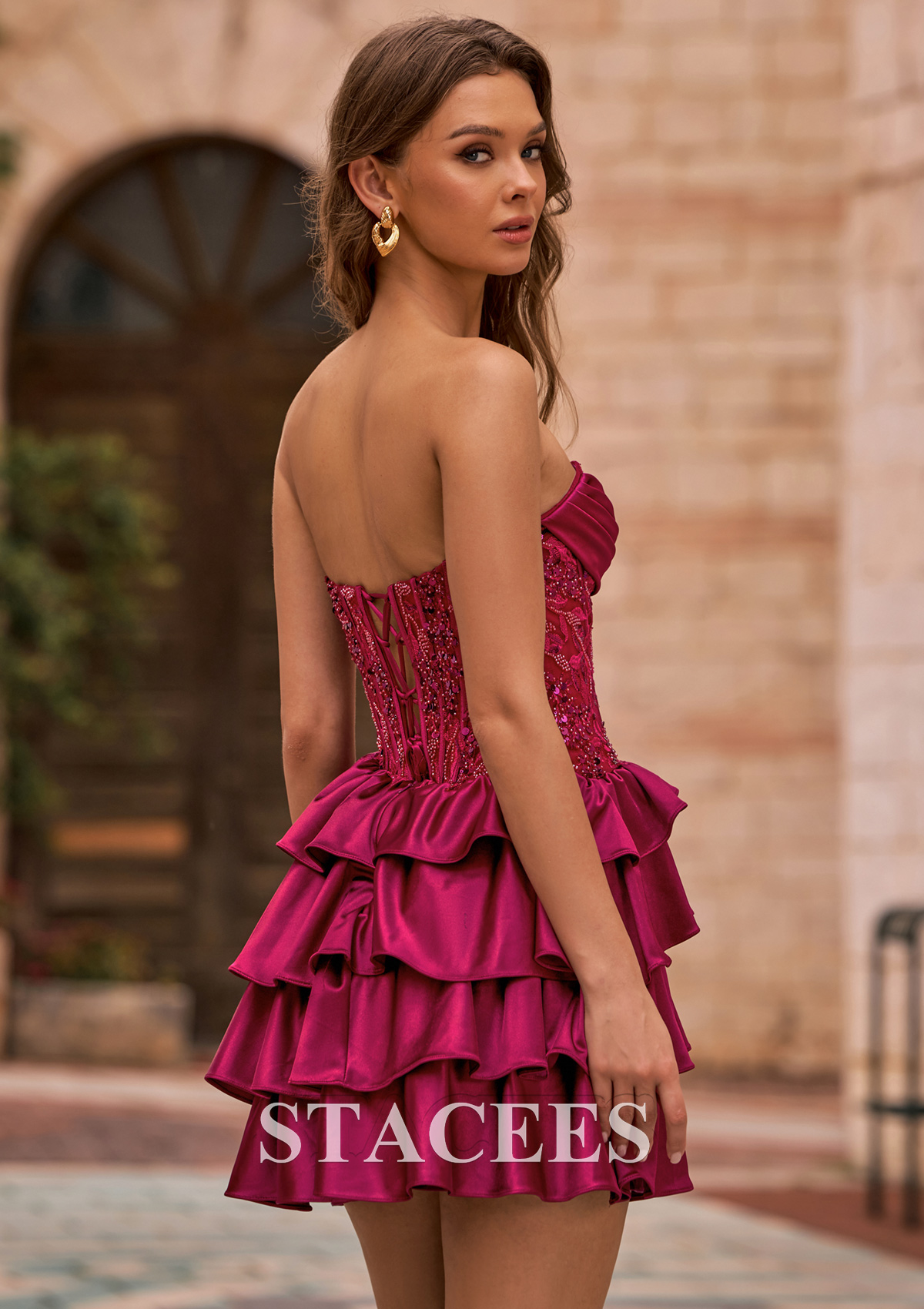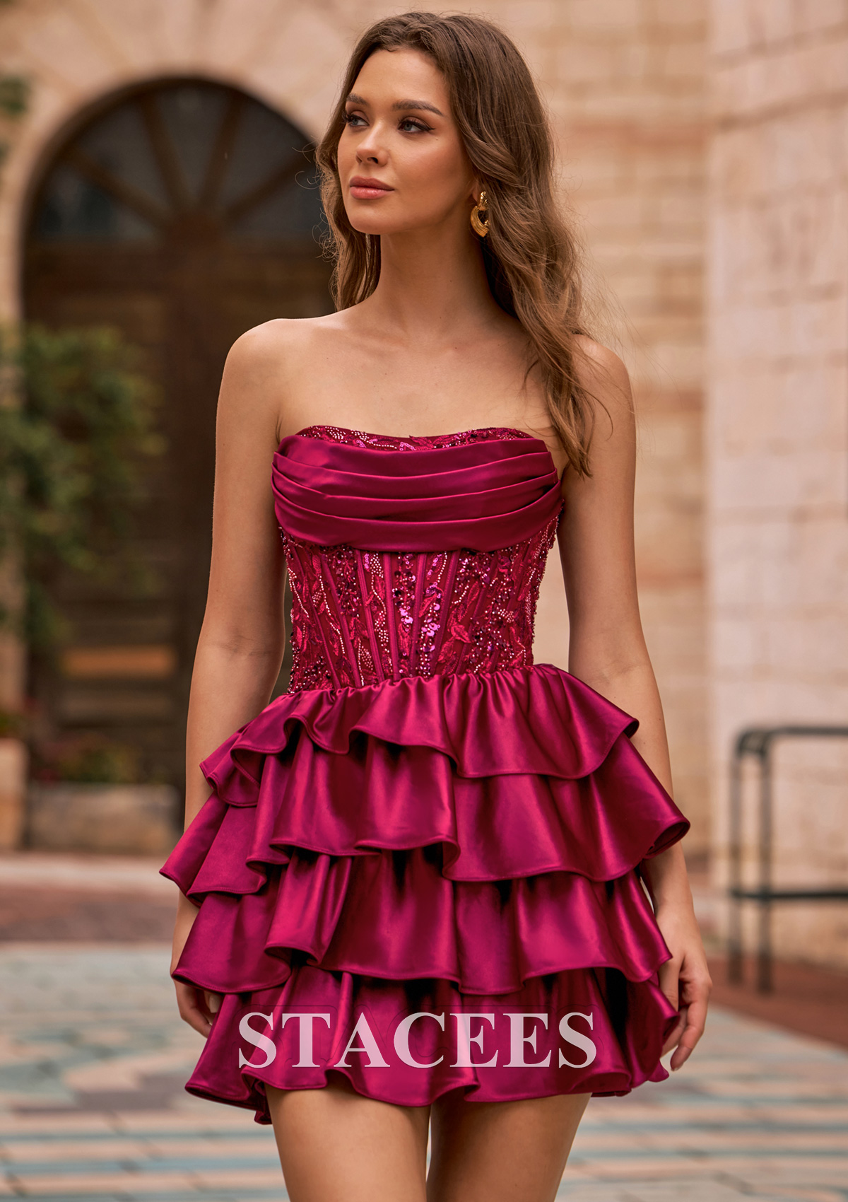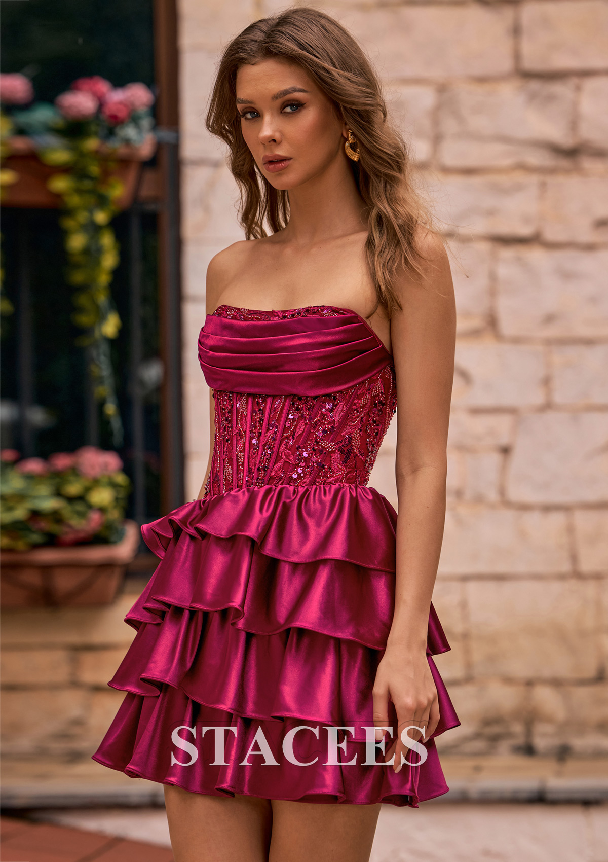This homecoming dress features a vibrant burgundy hue and a strapless, sweetheart bodice. The corset-style top is intricately adorned with shimmering beadwork and embroidery, providing both structure and elegance. The bodice flows into a layered, tiered ruffle skirt made of lustrous silk like satin fabric, creating a playful and voluminous silhouette. The back showcases lace-up detailing, allowing for an adjustable and secure fit. This dress perfectly blends glamorous embellishment with youthful sophistication—ideal for a standout homecoming look.