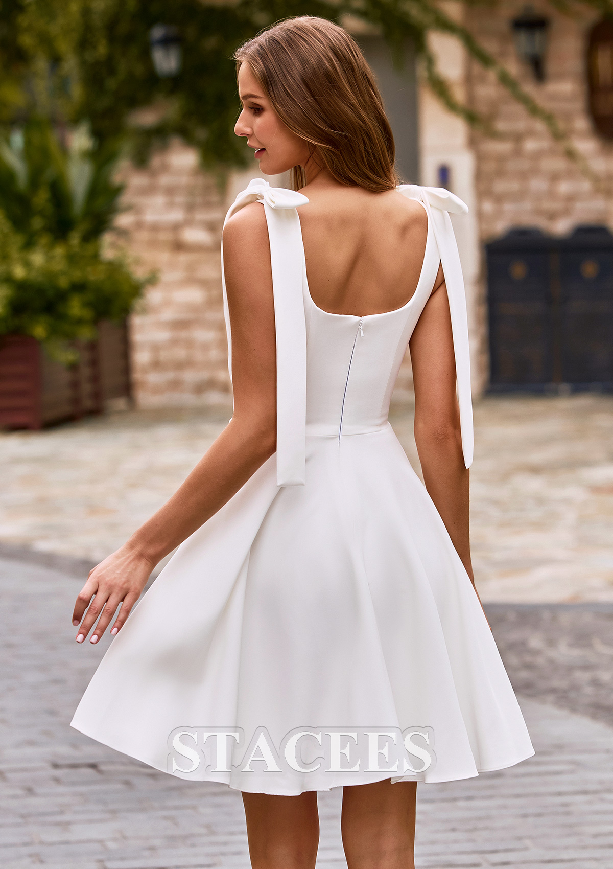 A-line Stretch Crepe Wedding Dress Square Neckline Short/Mini with Bowknot S3105W - Wedding Dresses - Stacees.co.uk