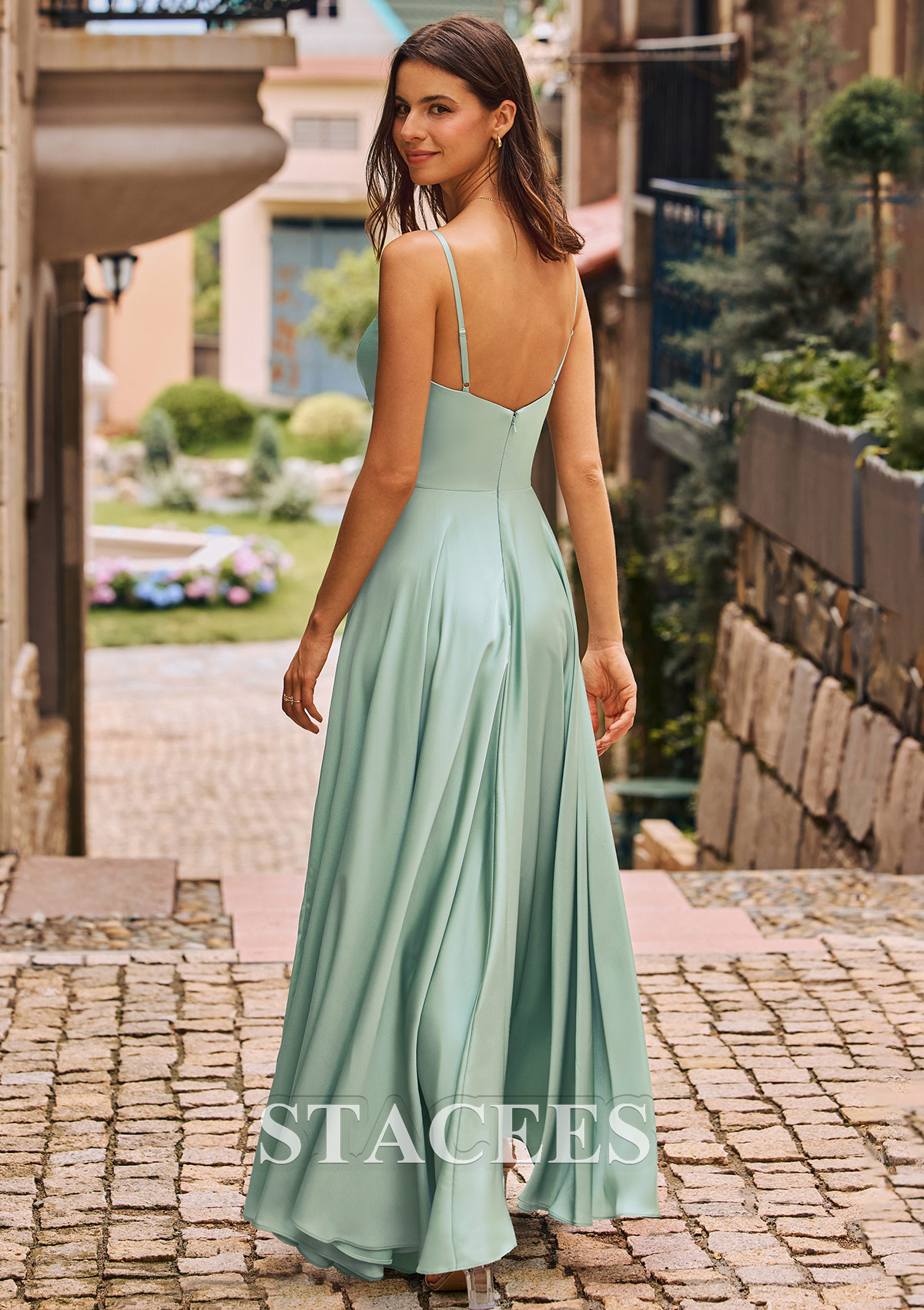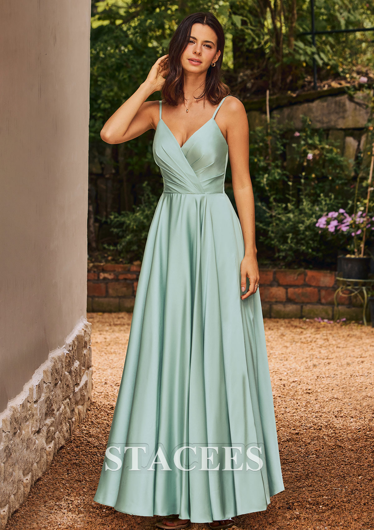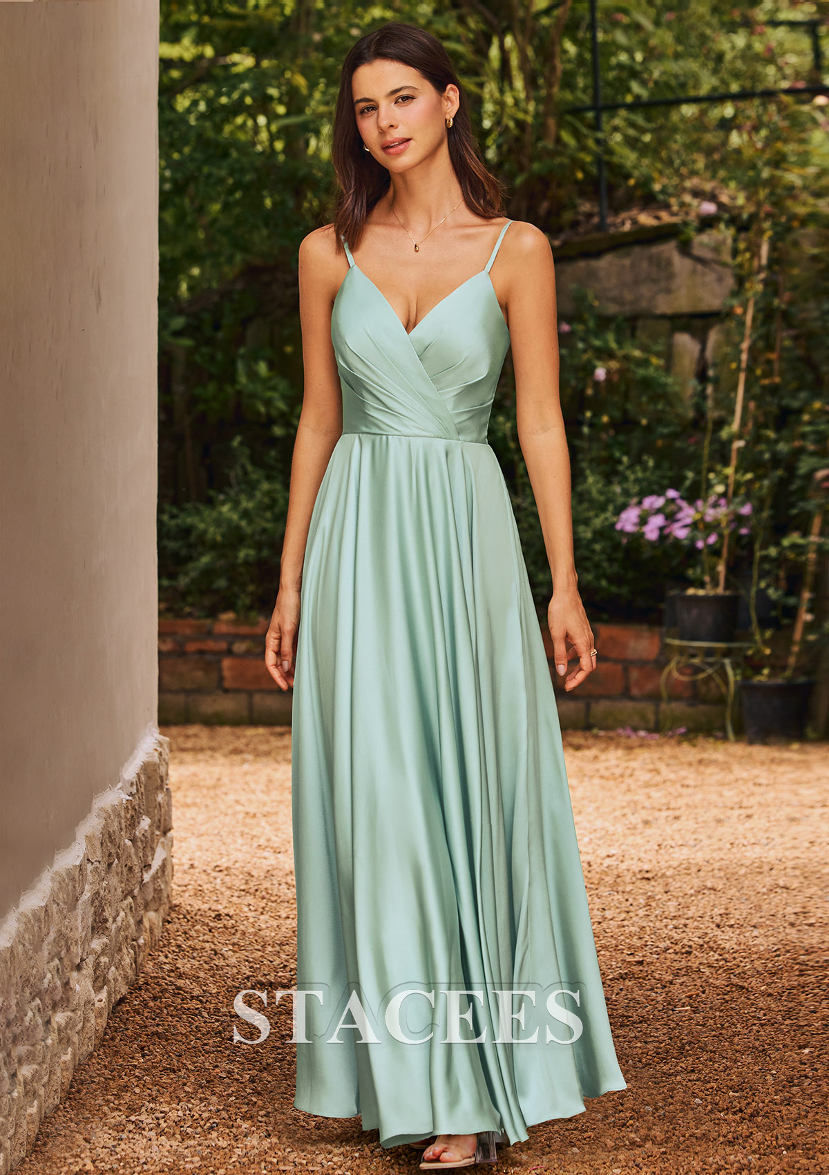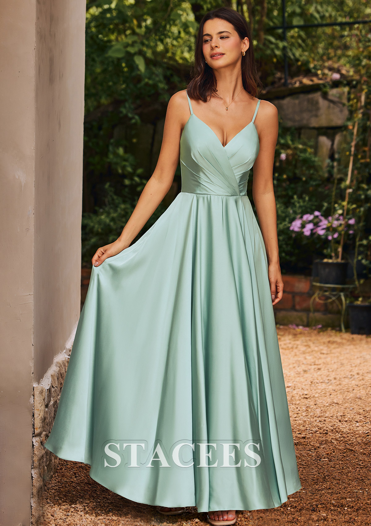 A-line Stretch Satin Bridesmaid Dress V Neck Floor-Length with Pleated S6055B - Bridesmaid Dresses - Stacees.co.uk