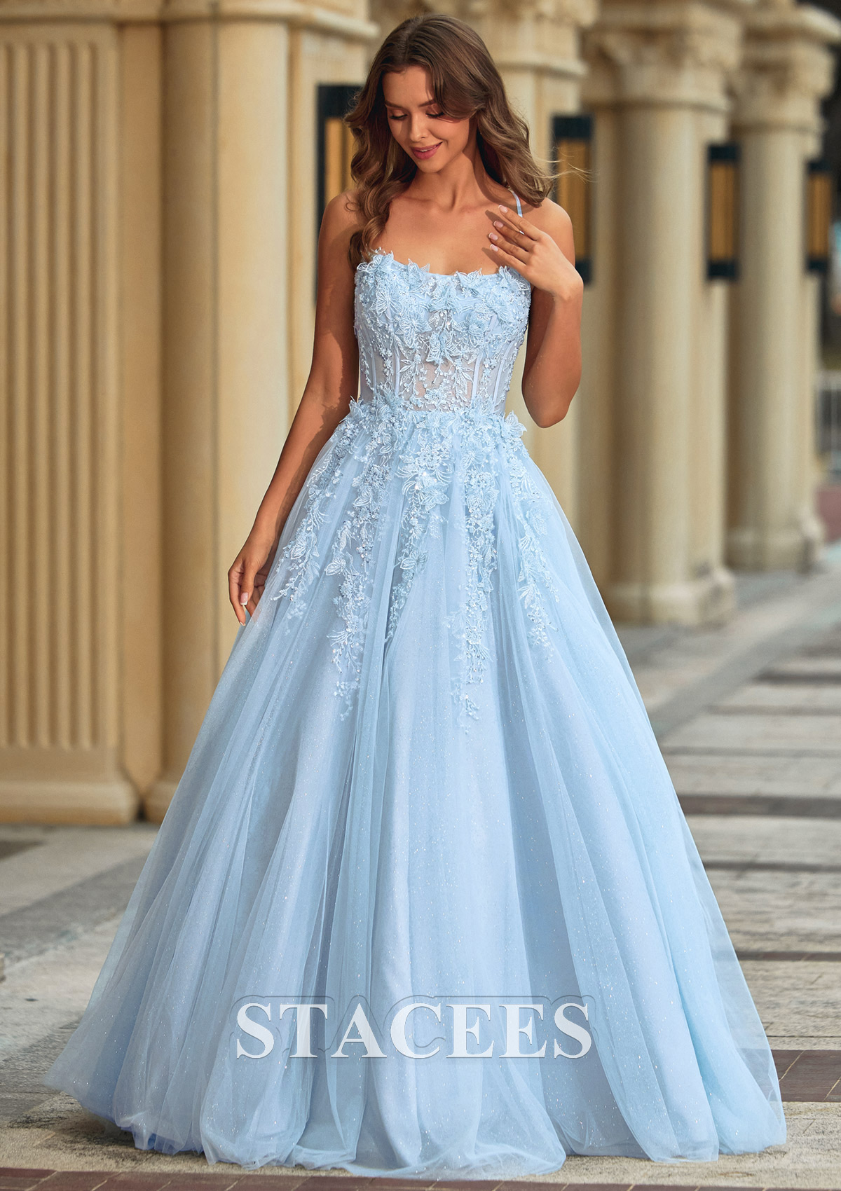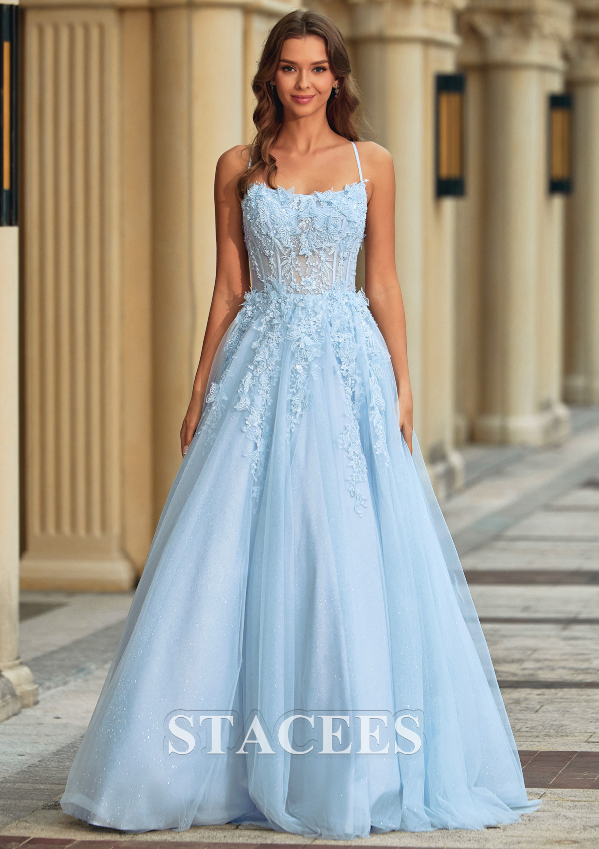 A-line Tulle Prom Dress Scoop Neck Sweep Train with Sequins Glitter Butterfly