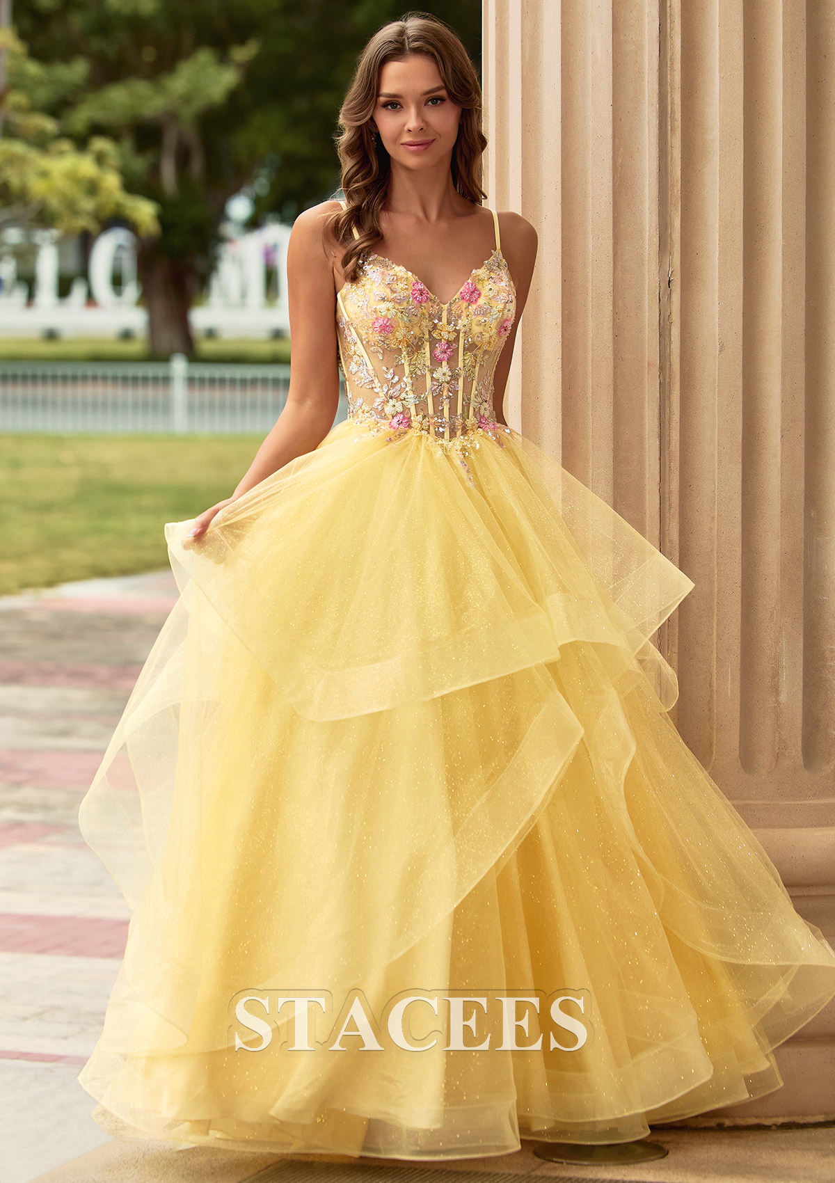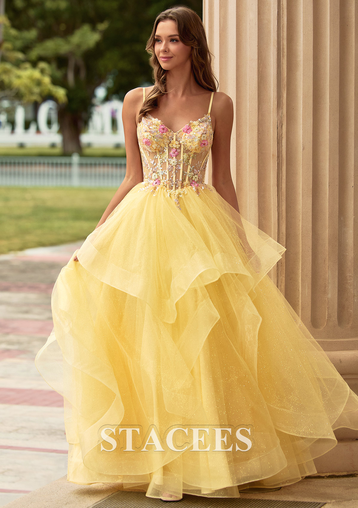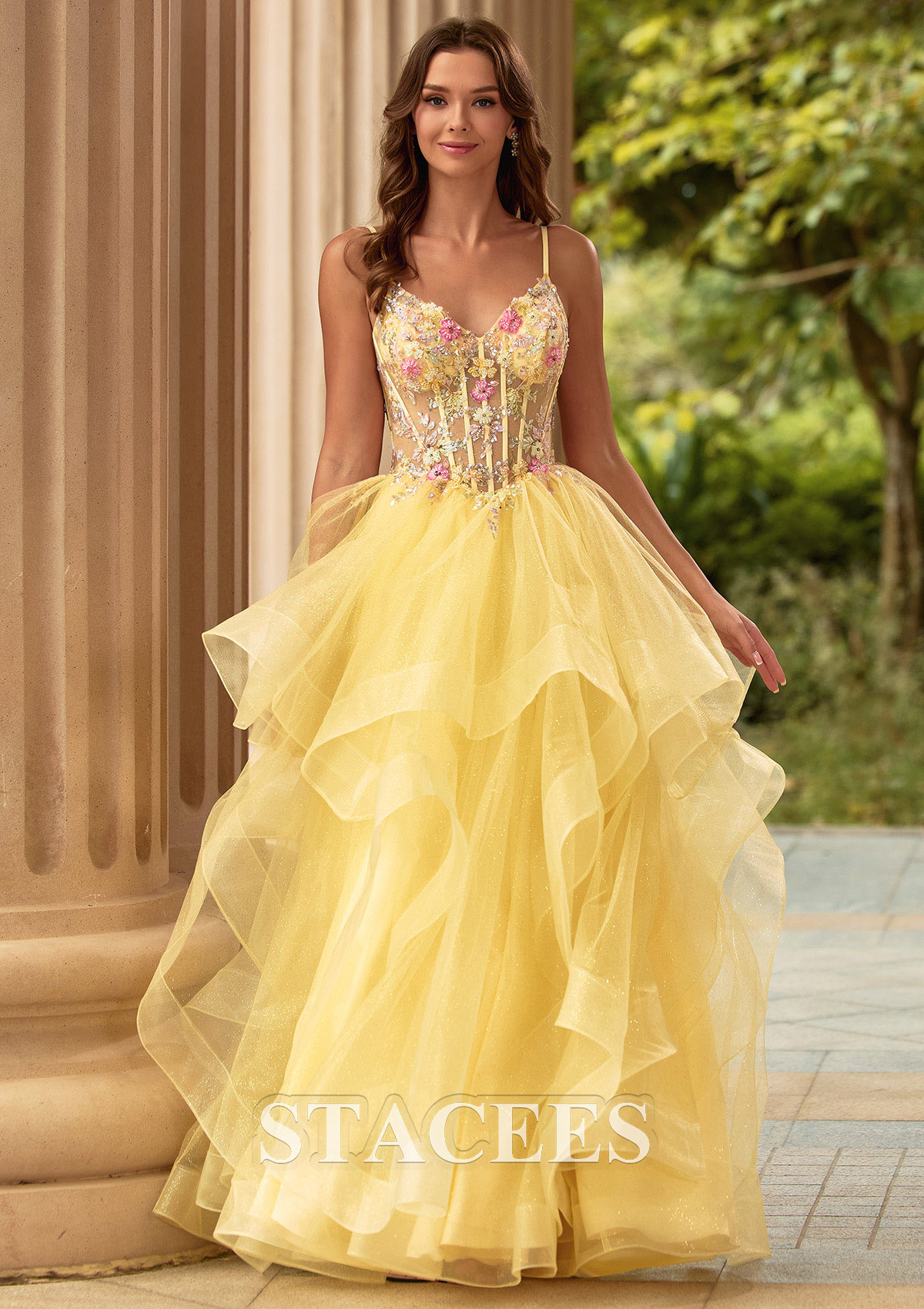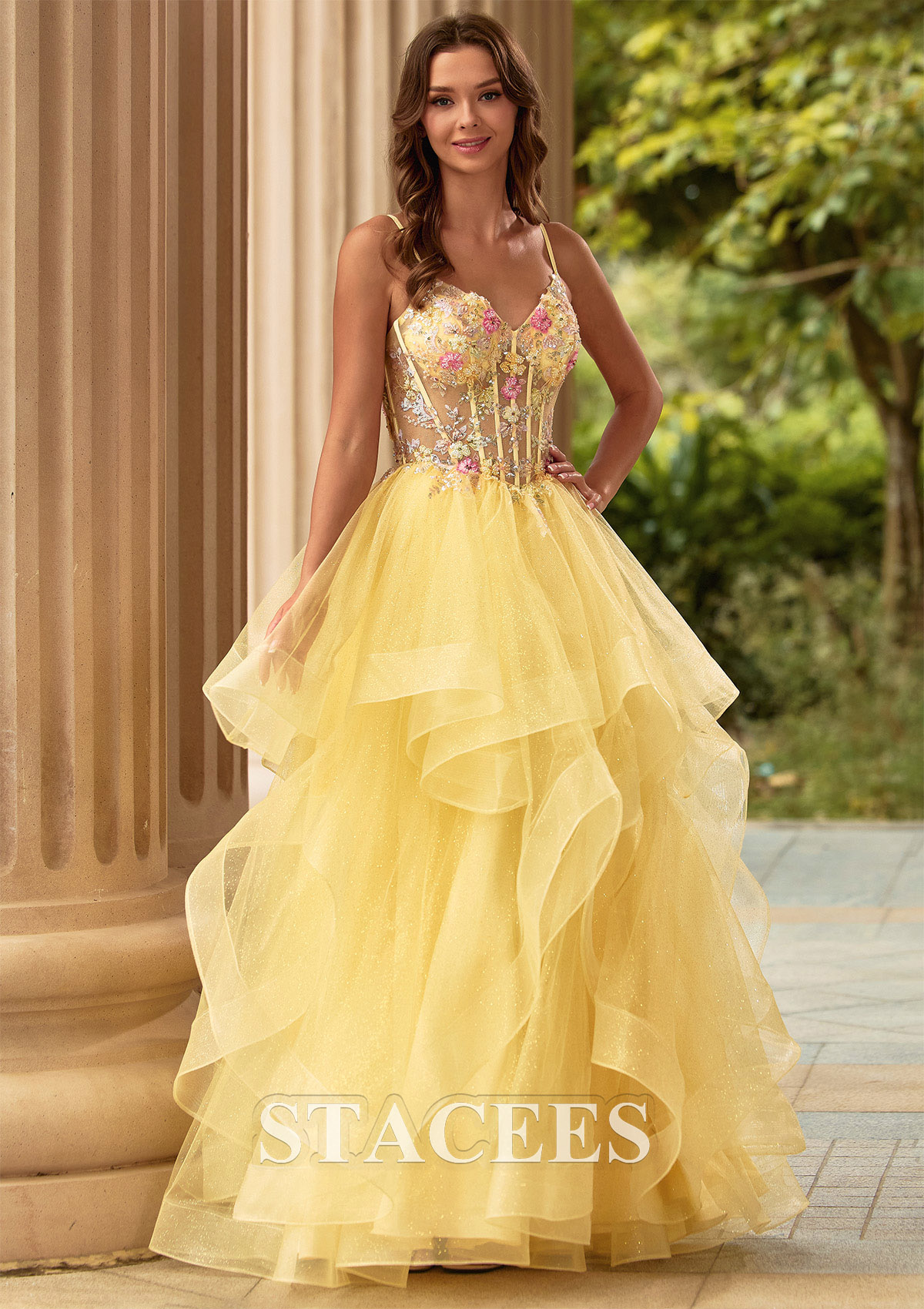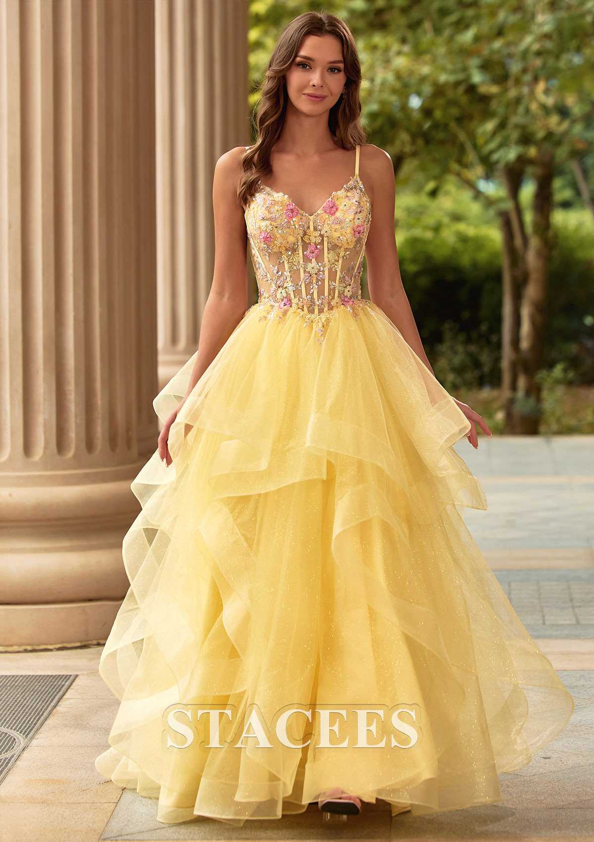 A-line Tulle Prom Dress V Neck Floor-Length with Appliqued Beading Ruffles Sequins Glitter S9018PA - Prom Dresses - Stacees.co.uk