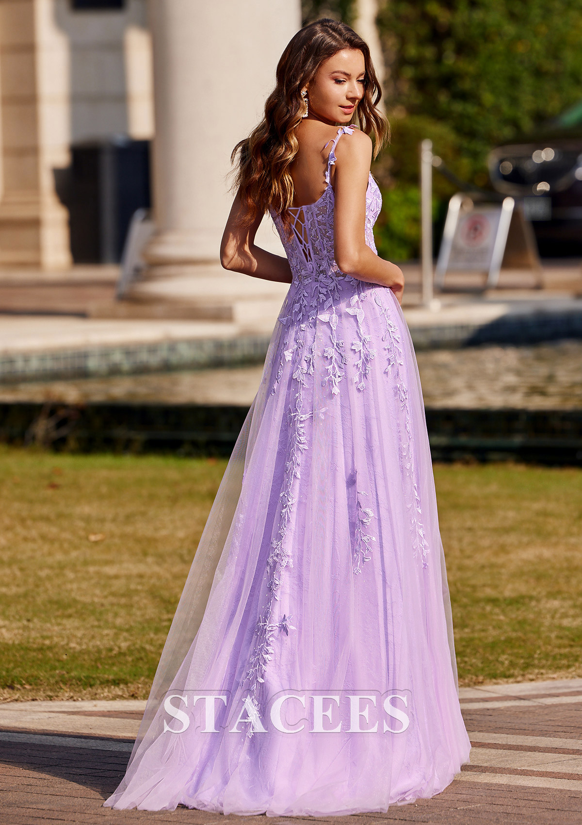 A-line Tulle Prom Dress V Neck Sweep Train with Beading Lace