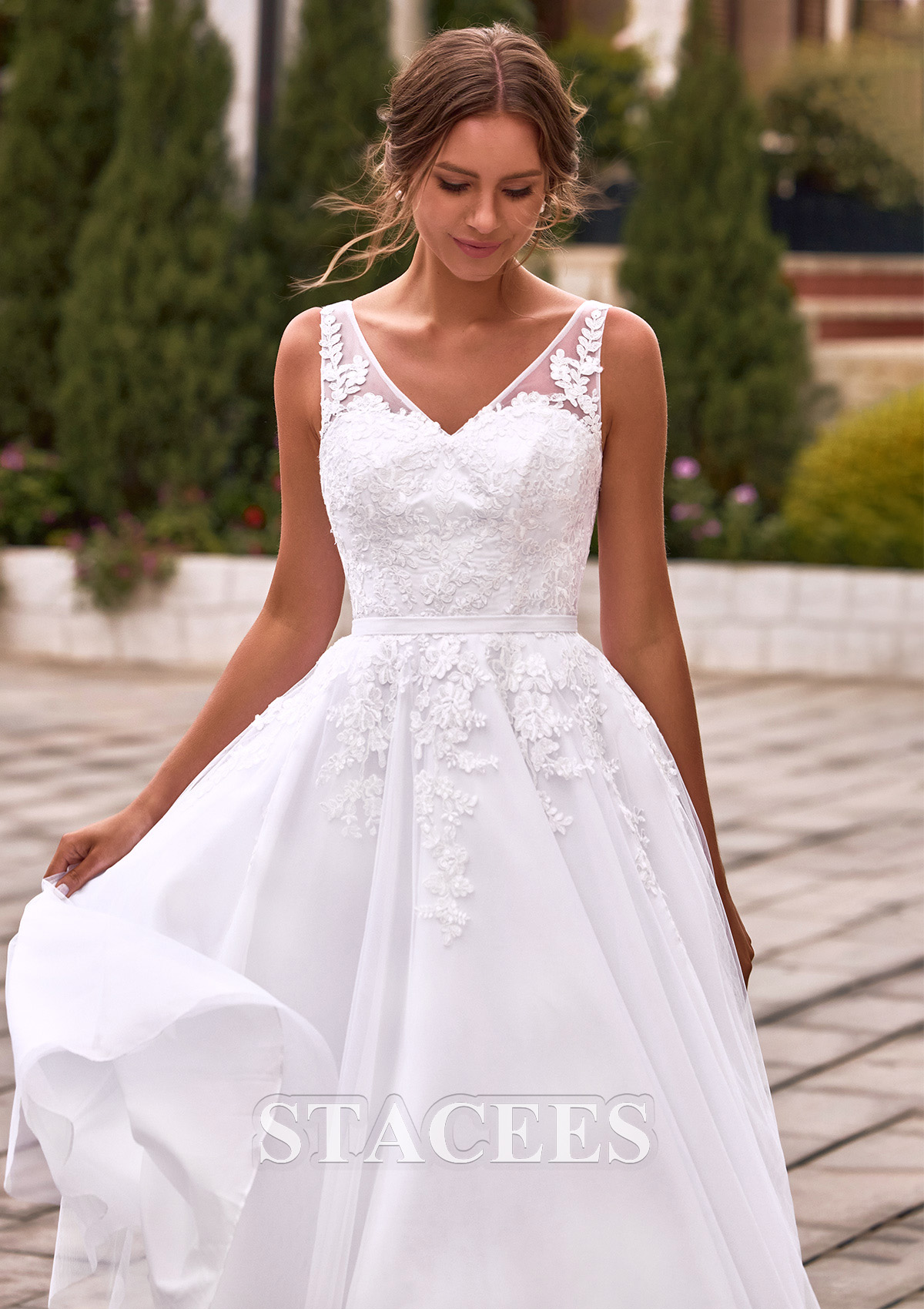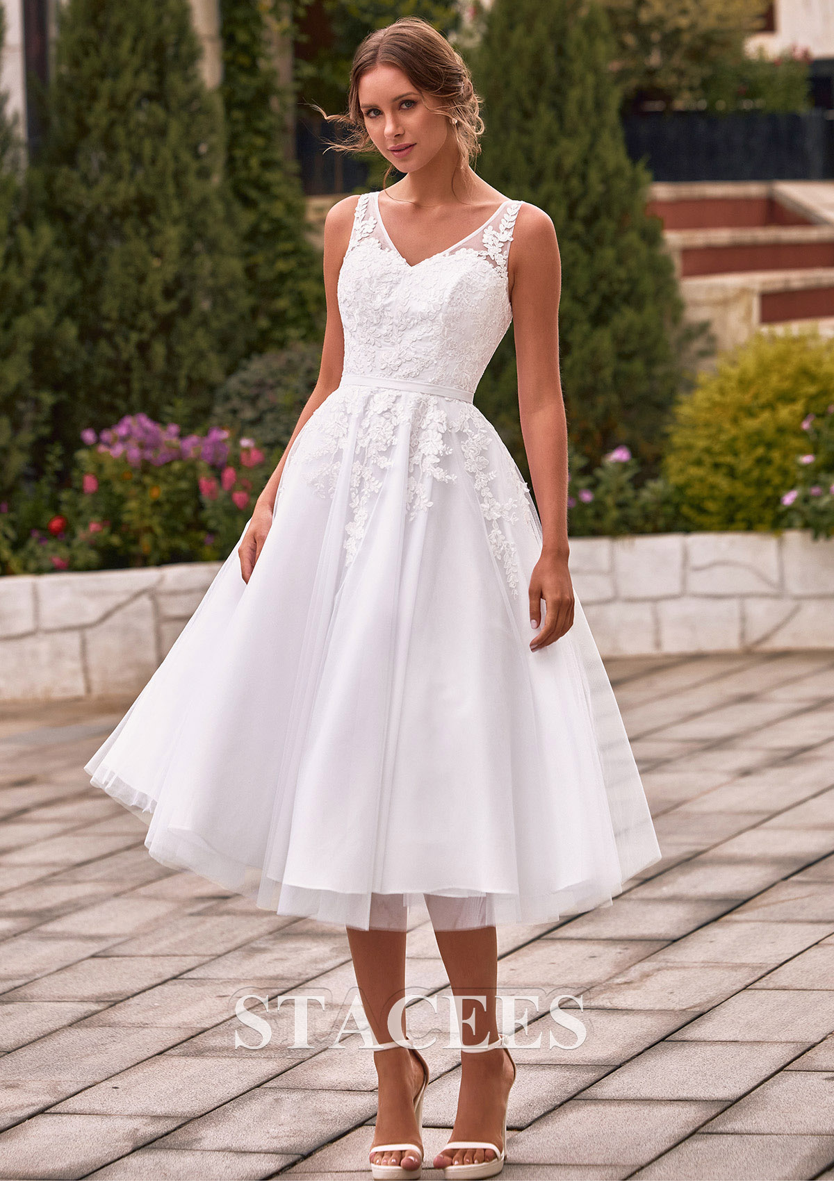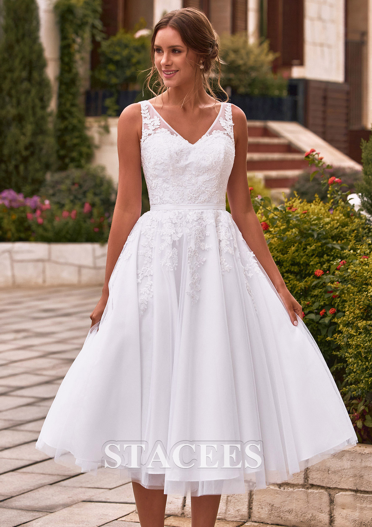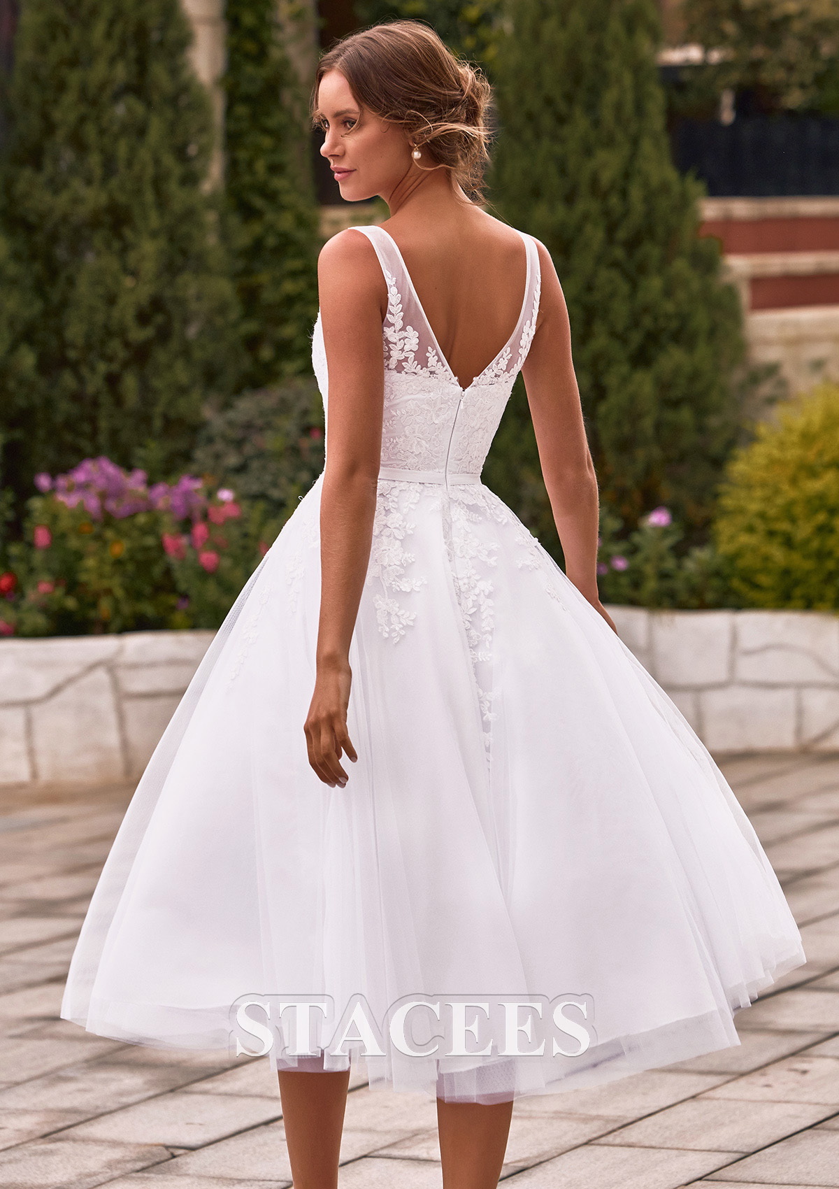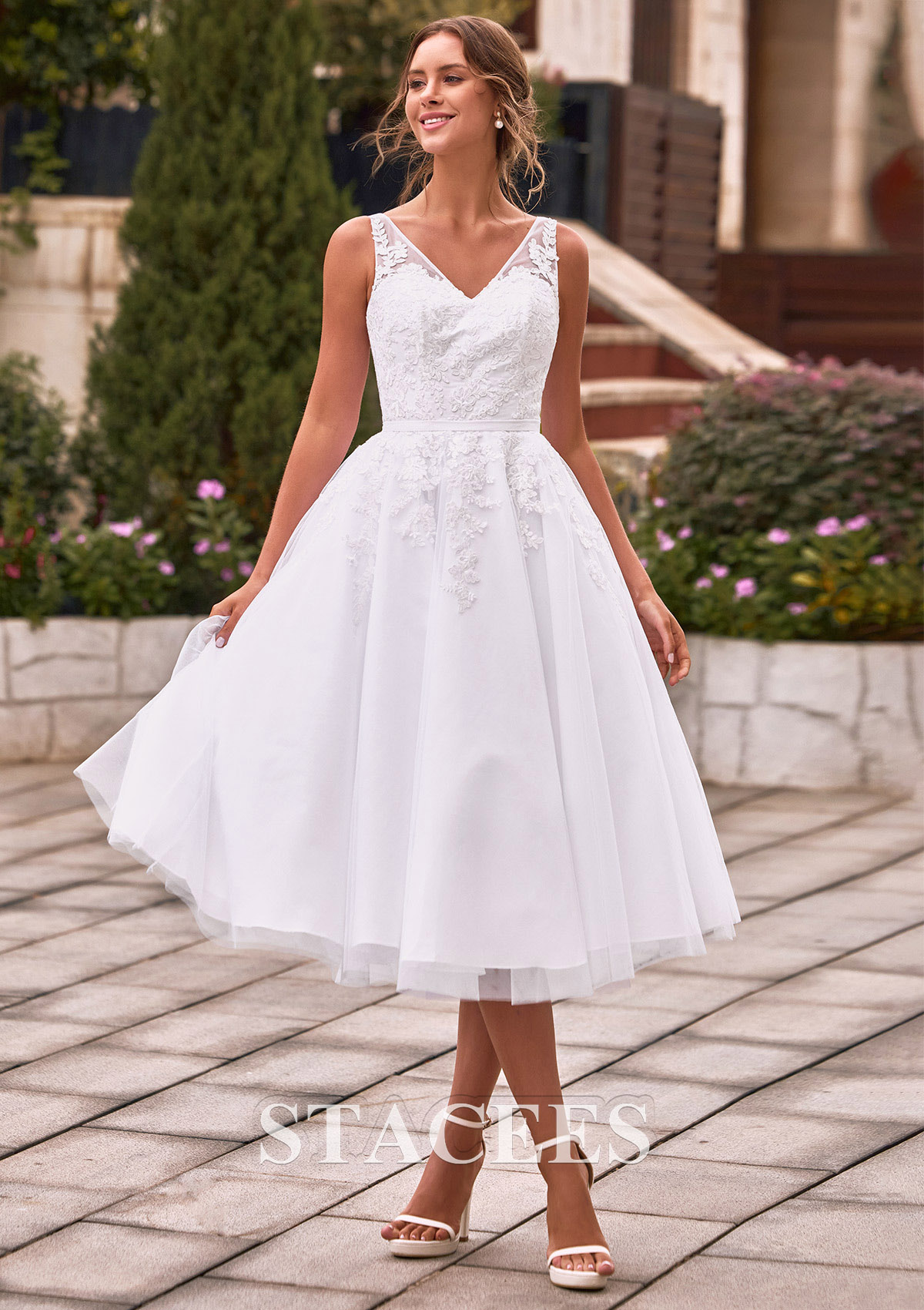 A-line Tulle Wedding Dress V Neck Tea-Length with Lace Pleated Sashes S3181W - Wedding Dresses - Stacees.co.uk