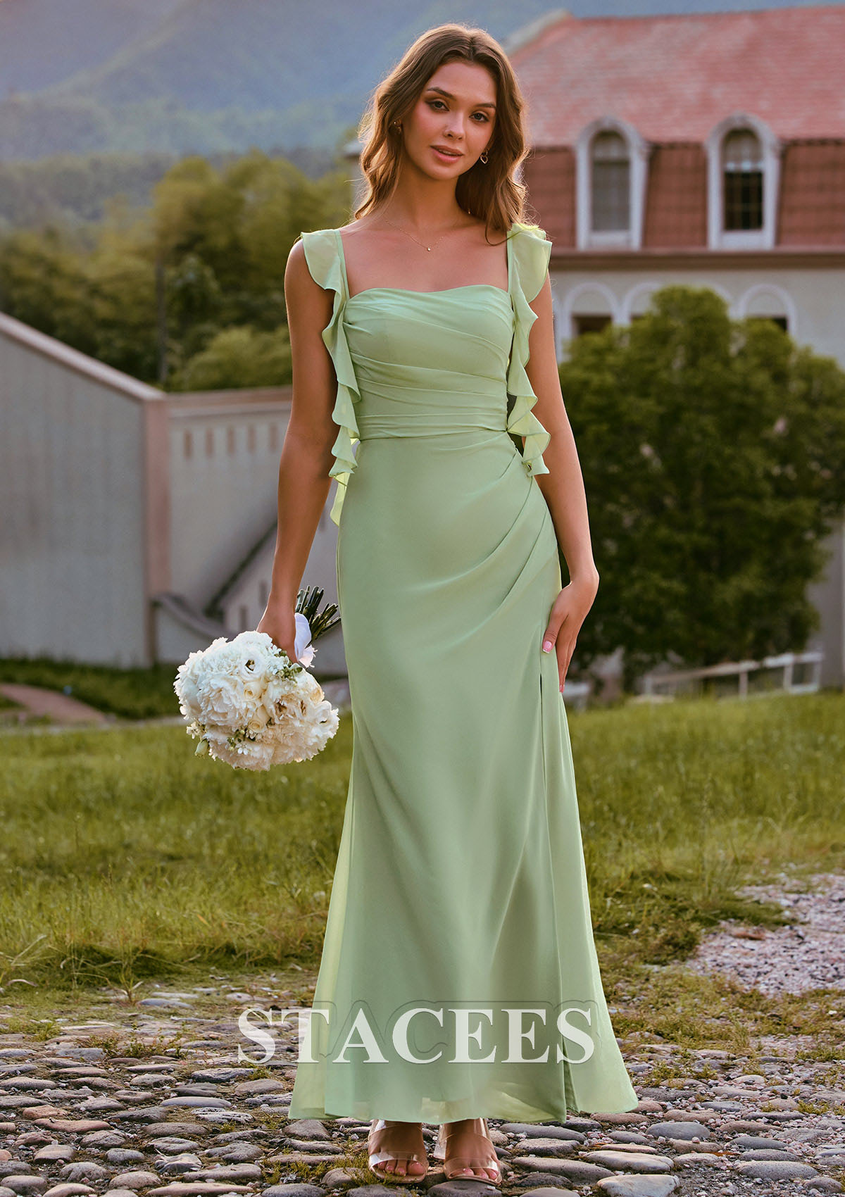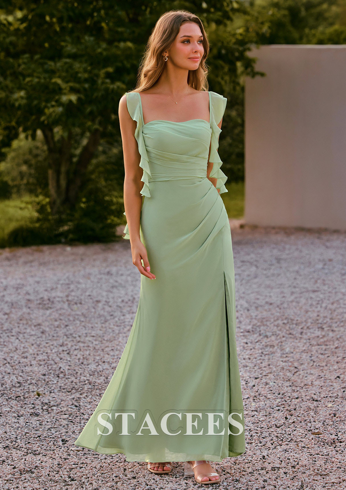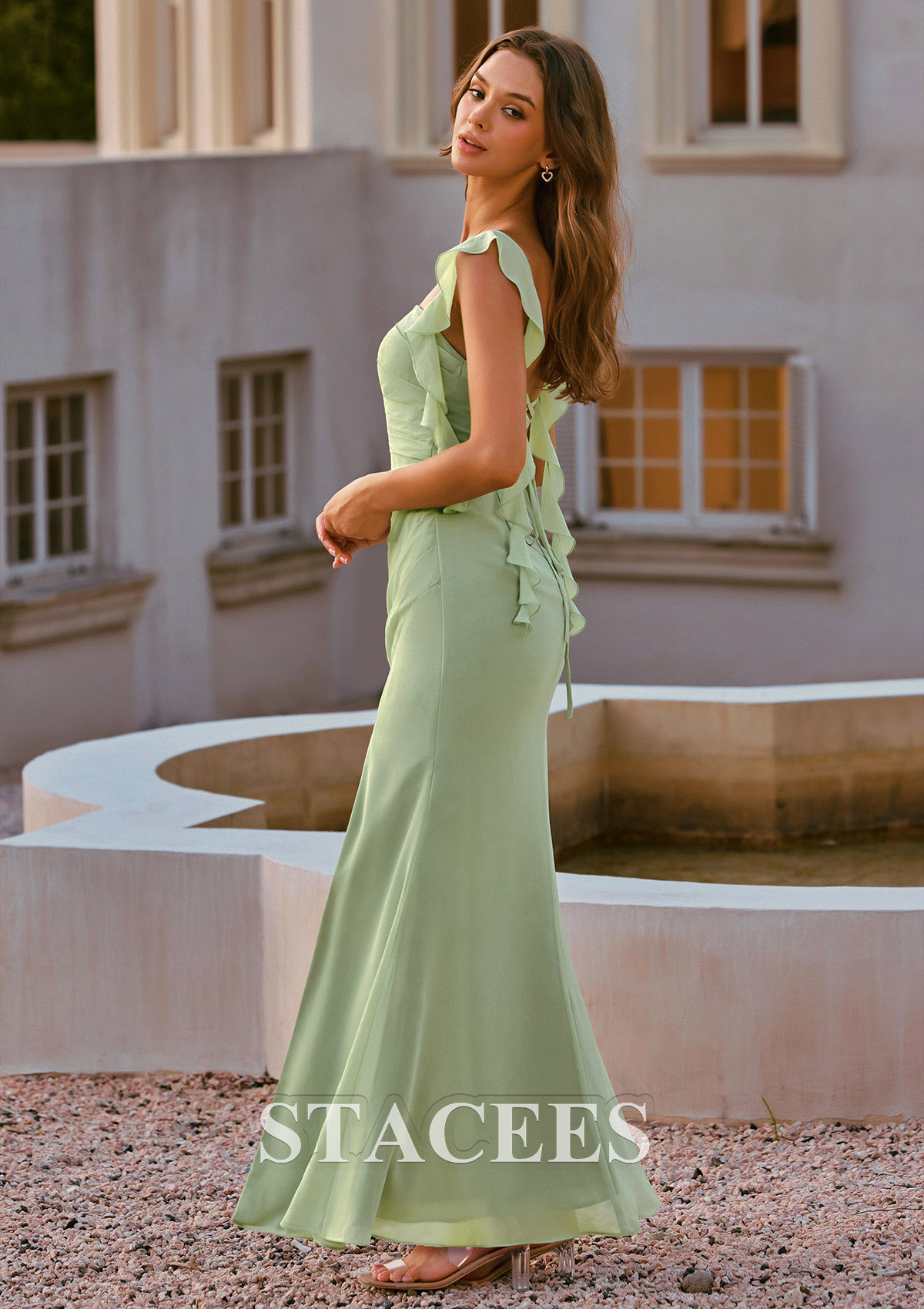 This Sheath/Colum dress features a sweetheart neckline that accentuates your collarbone. Lightly sheer, ruffled straps drape gently, creating a flowing silhouette. Delicate pleats accentuate your curves, while a high left slit, accented with pleats, creates a light and elegant look. Crisscross back accentuate the sensual curves of your back. The chiffon fabric drapes freely, creating a natural, flowing shape as you walk. Your gown is sure to captivate everyone.