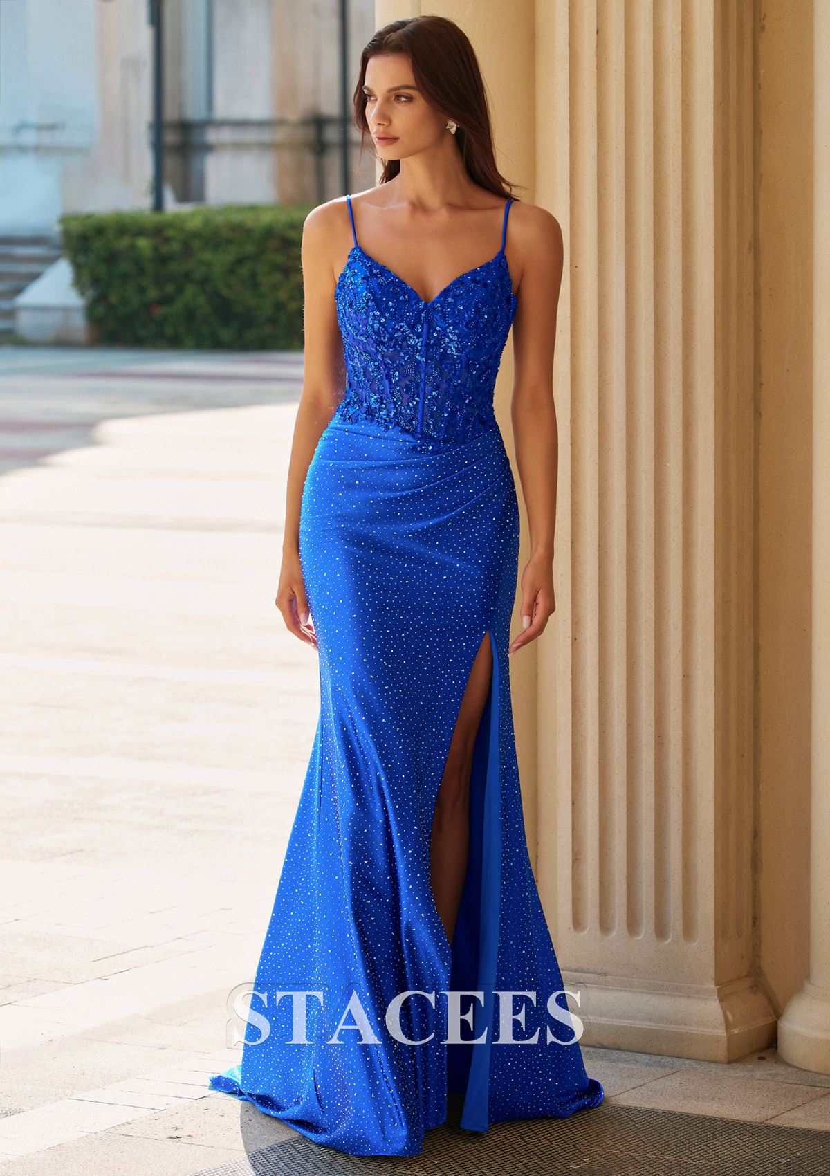 Sheath/Column Silk like Satin Prom Dress V Neck Sweep Train with Appliqued Beading Hot Fix Pleated Sequins Split S9073P - Prom Dresses - Stacees.co.uk