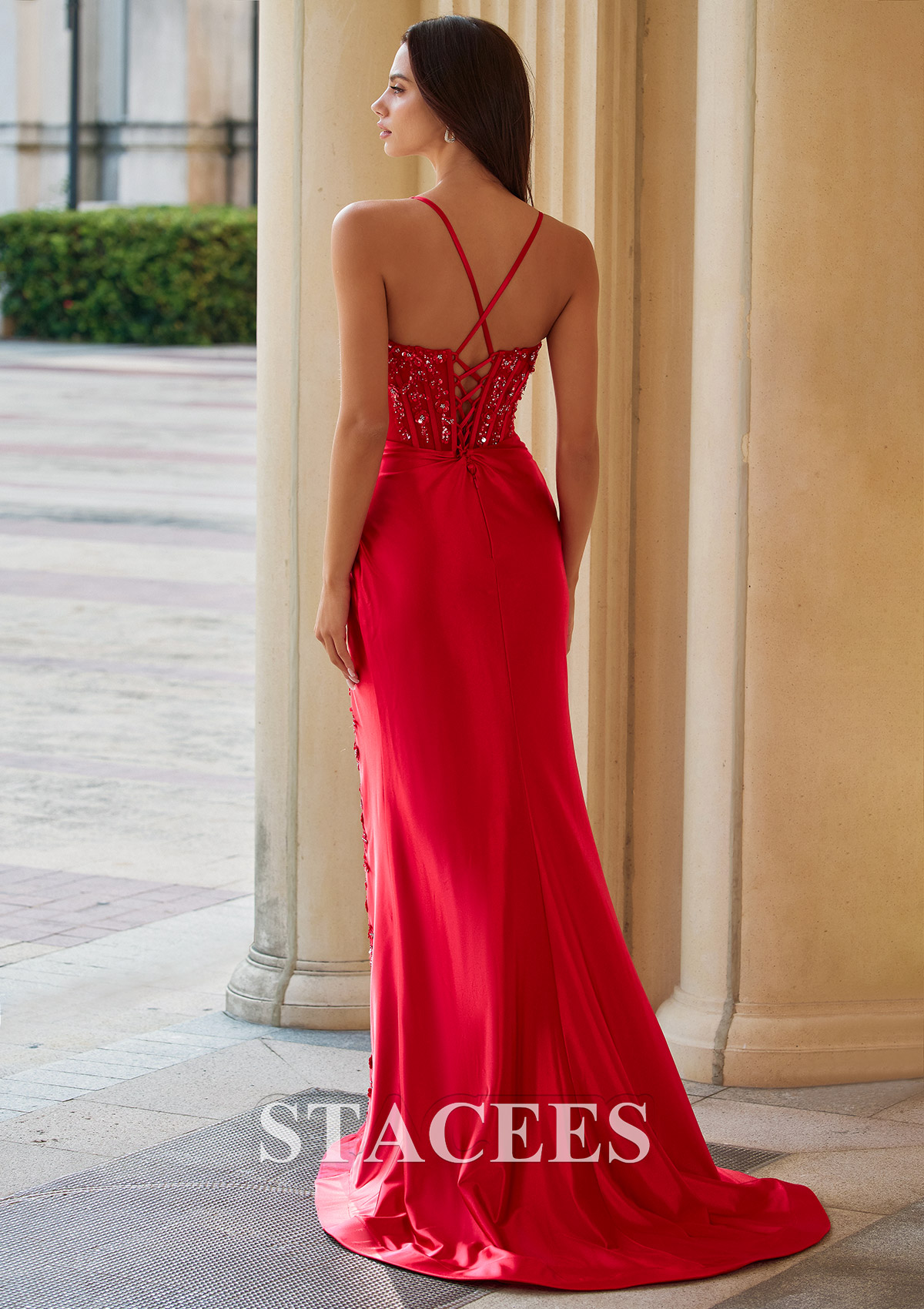 Sheath/Column Silk like Satin Prom Dress V Neck Sweep Train with Appliqued Beading Pleated Sequins Split S9081P - Prom Dresses - Stacees.co.uk