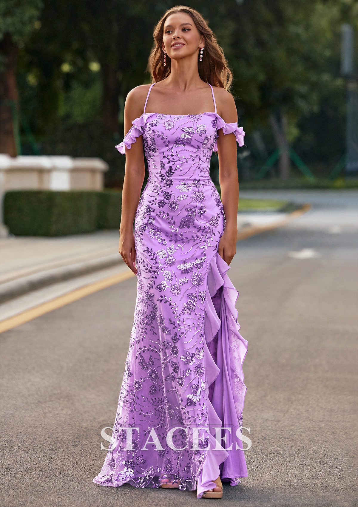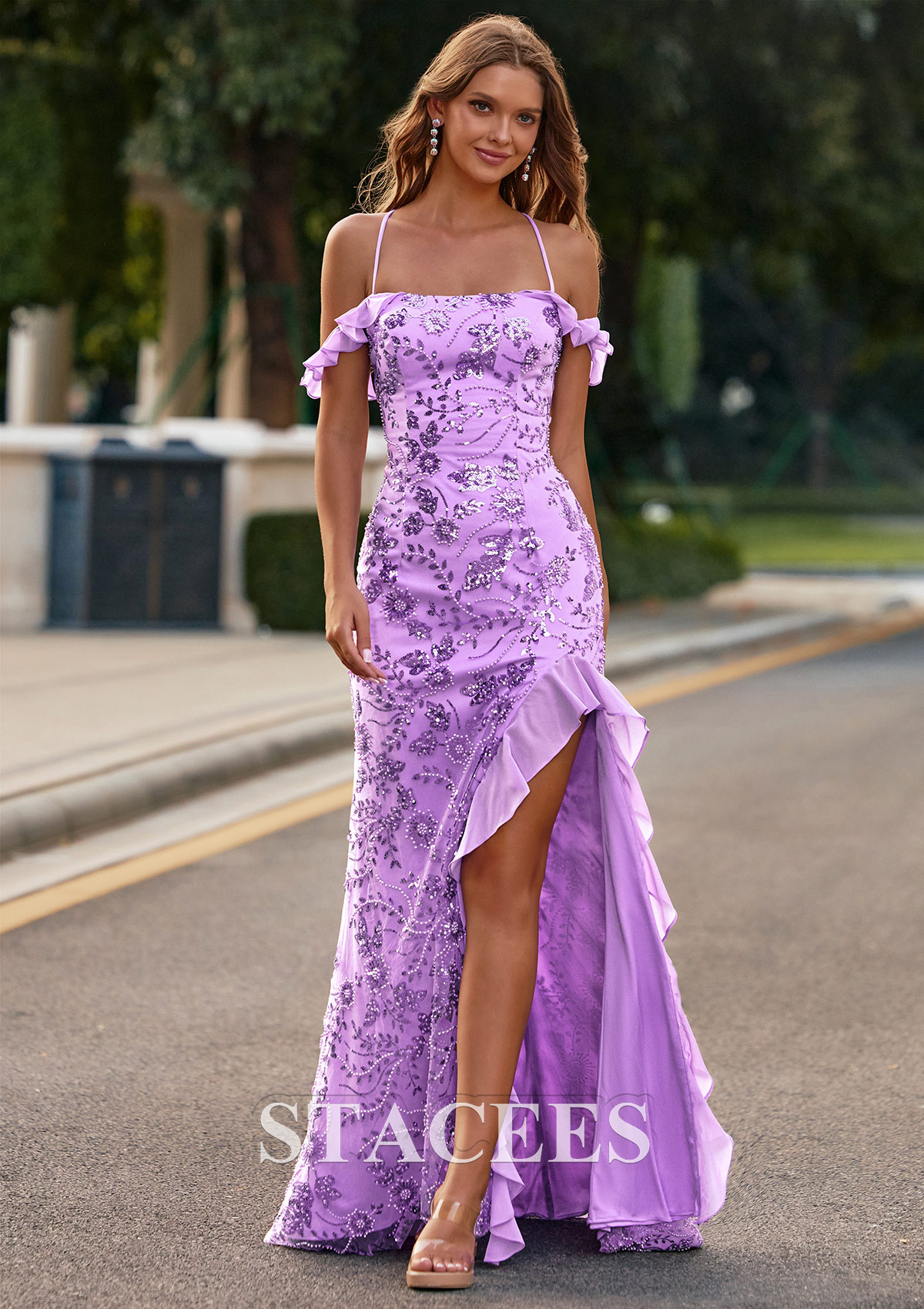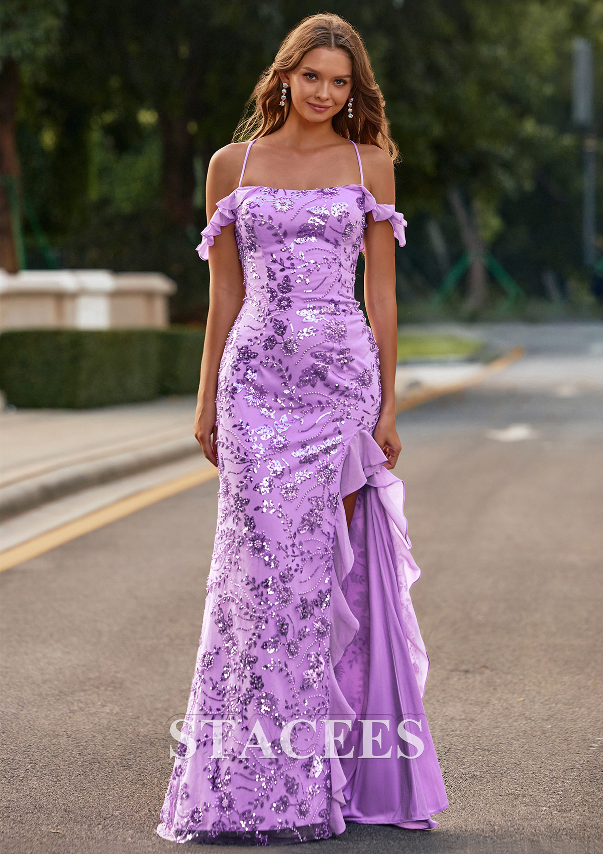 Sheath/Column Tulle Prom Dress Off-the-Shoulder Sweep Train with Sequins Split S8921P - Prom Dresses - Stacees.co.uk