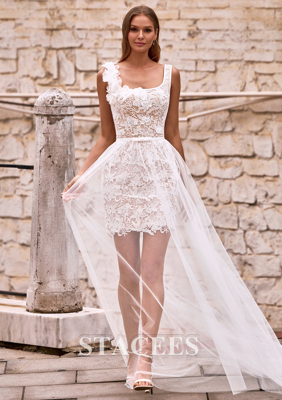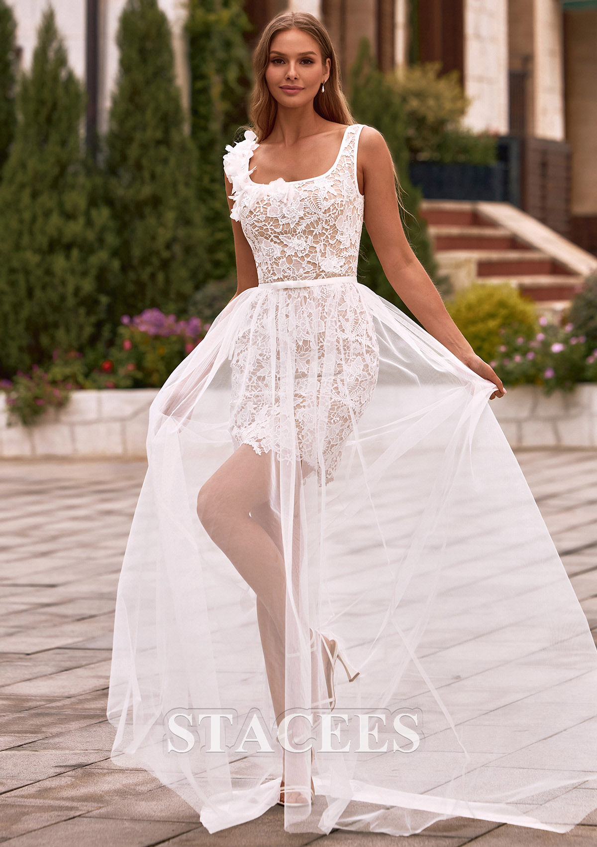 Sheath/Column Tulle Wedding Dress Square Neckline Detachable/Knock-down with Lace Flowers Waistband S3160WT - Wedding Dresses - Stacees.co.uk