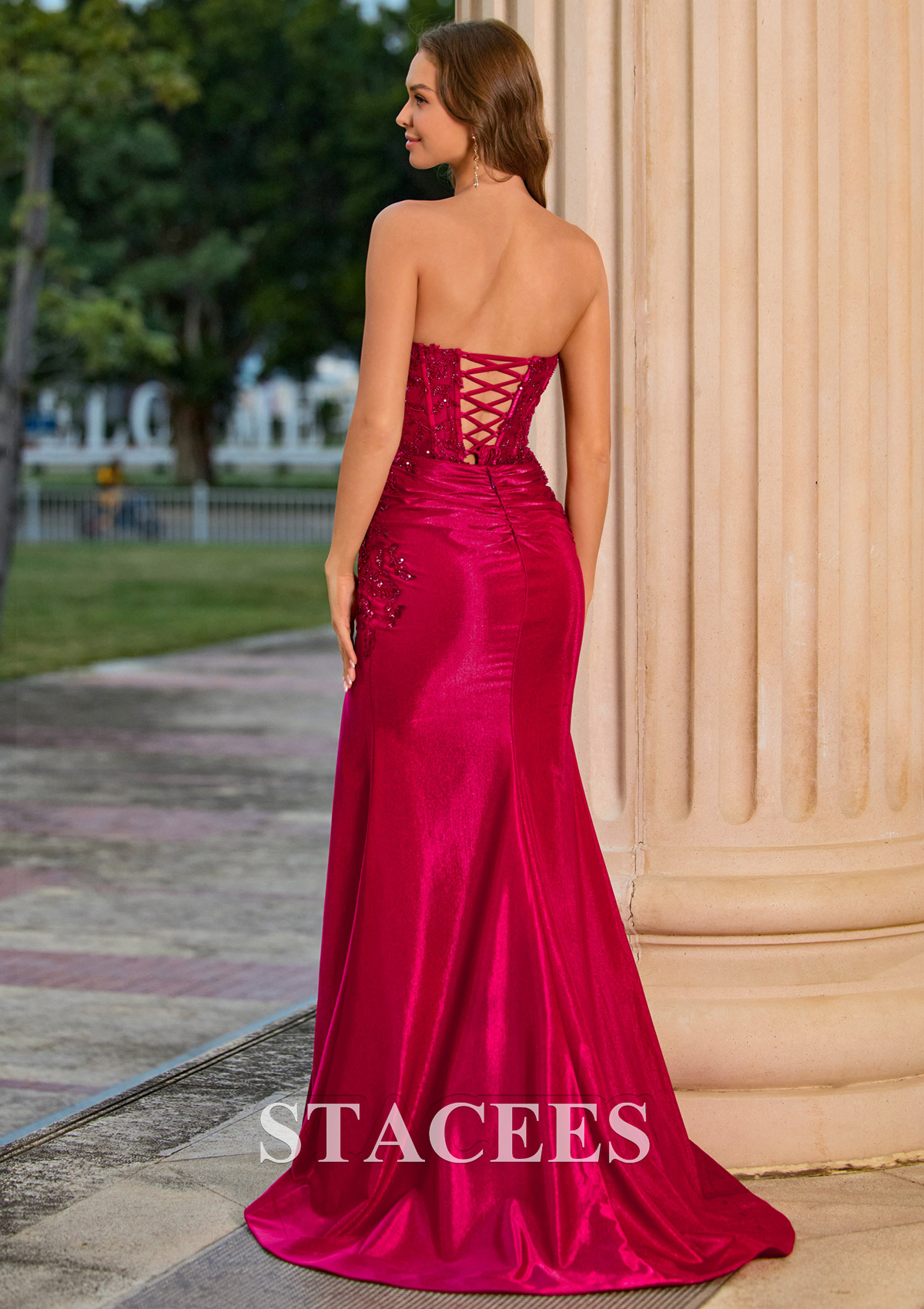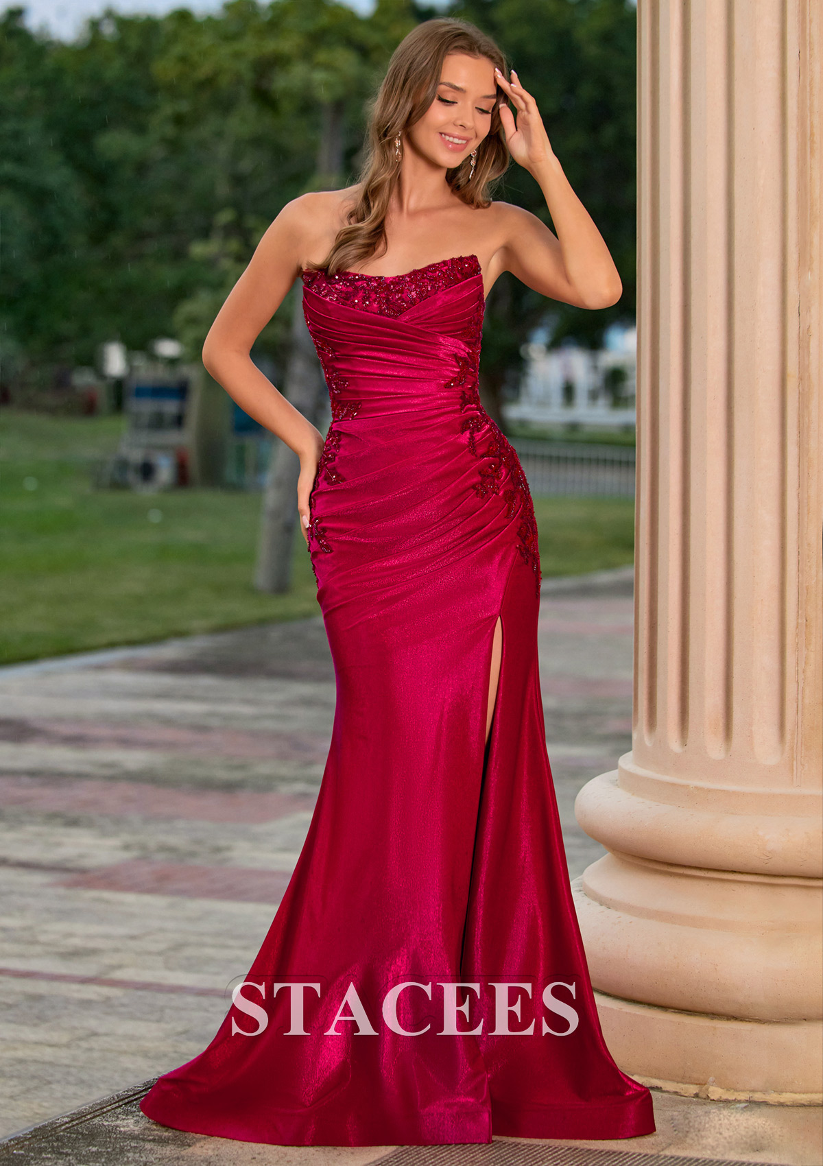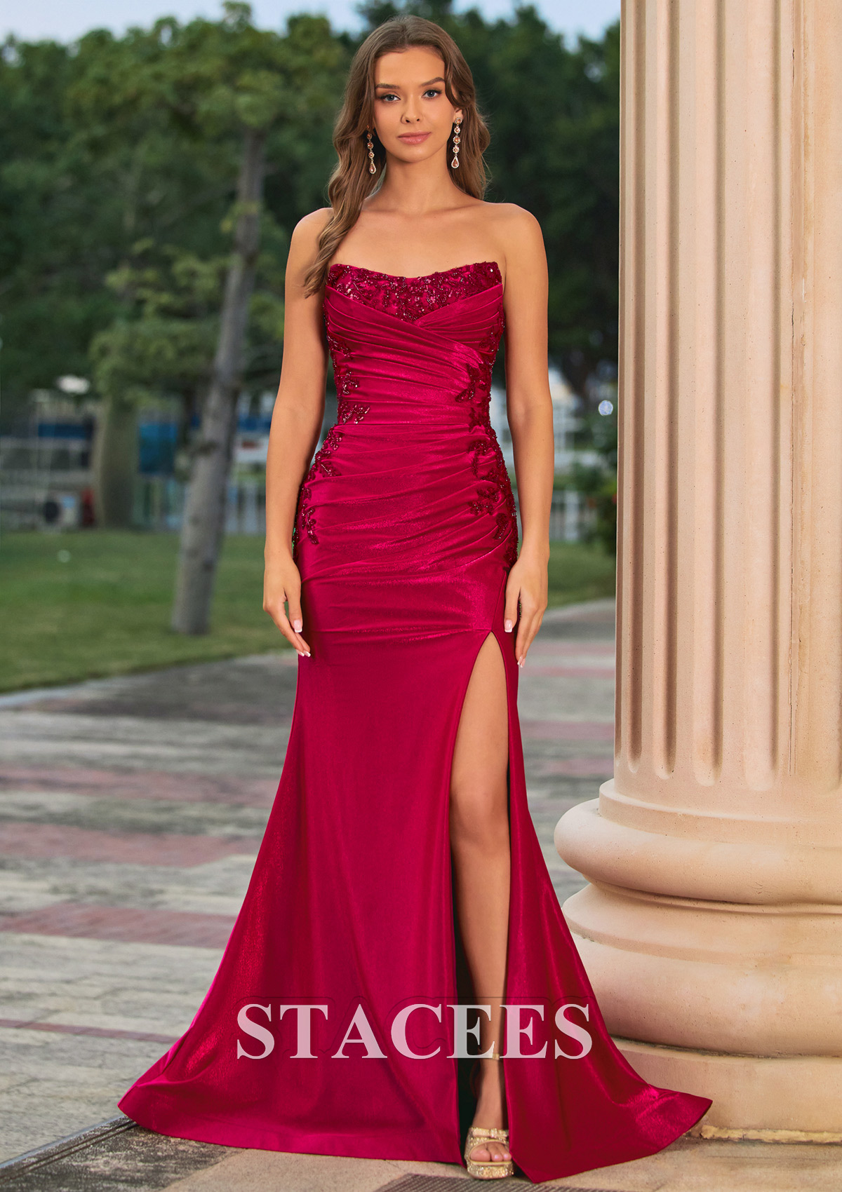 Trumpet/Mermaid Knit Prom Dress Scoop Neck Sweep Train with Appliqued Pleated Sequins Split S9080P - Prom Dresses - Stacees.co.uk