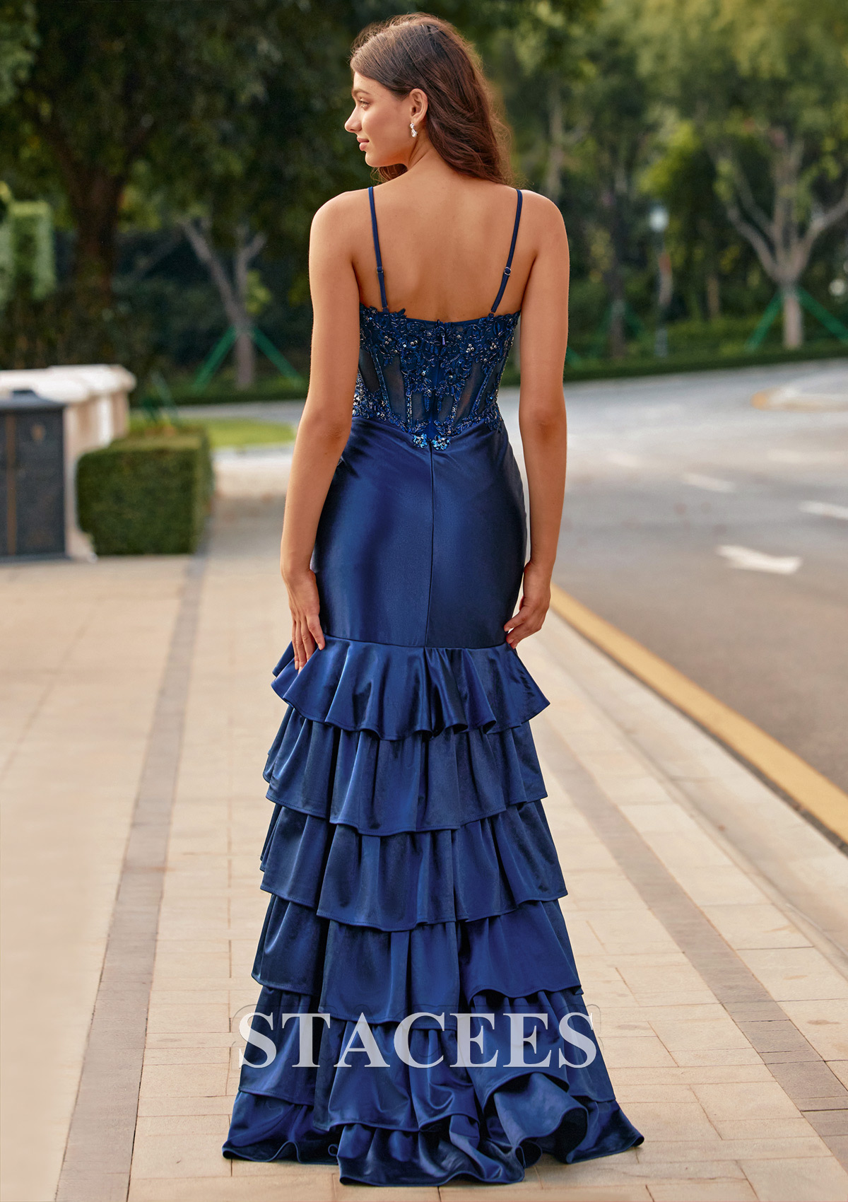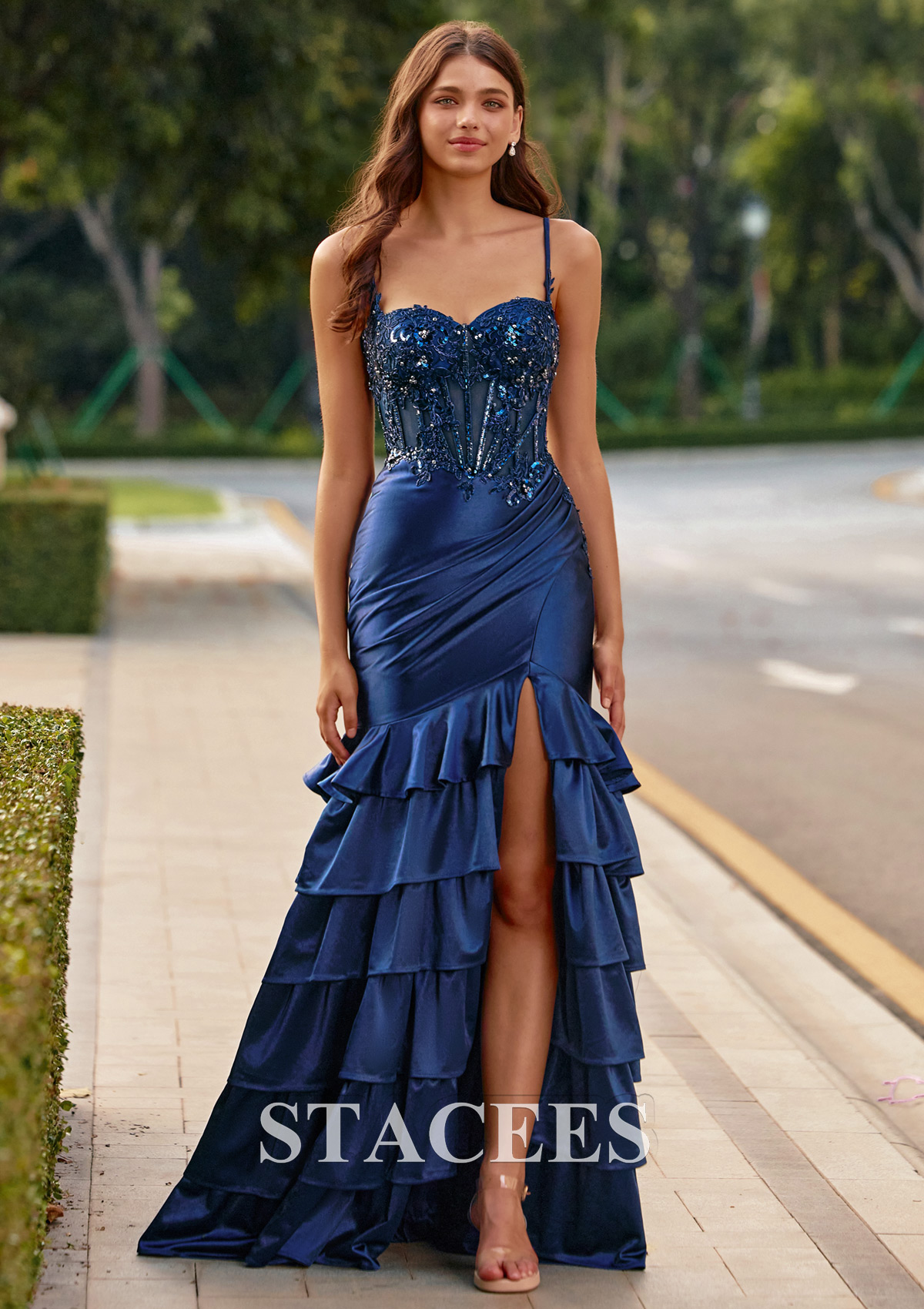 Trumpet/Mermaid Silk like Satin Prom Dress Sweetheart Sweep Train with Appliqued Beading Pleated Sequins