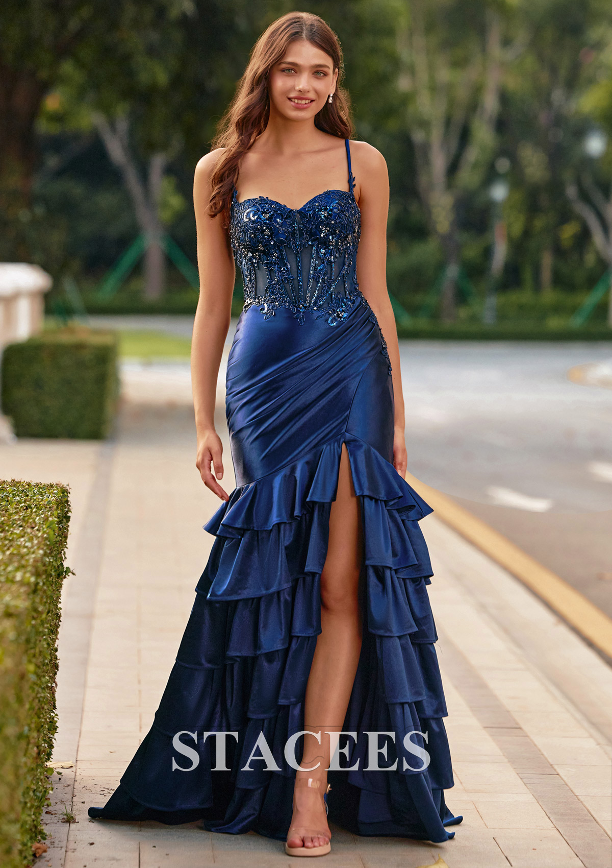 Trumpet/Mermaid Silk like Satin Prom Dress Sweetheart Sweep Train with Appliqued Beading Pleated Sequins S8926P - Prom Dresses - Stacees.co.uk