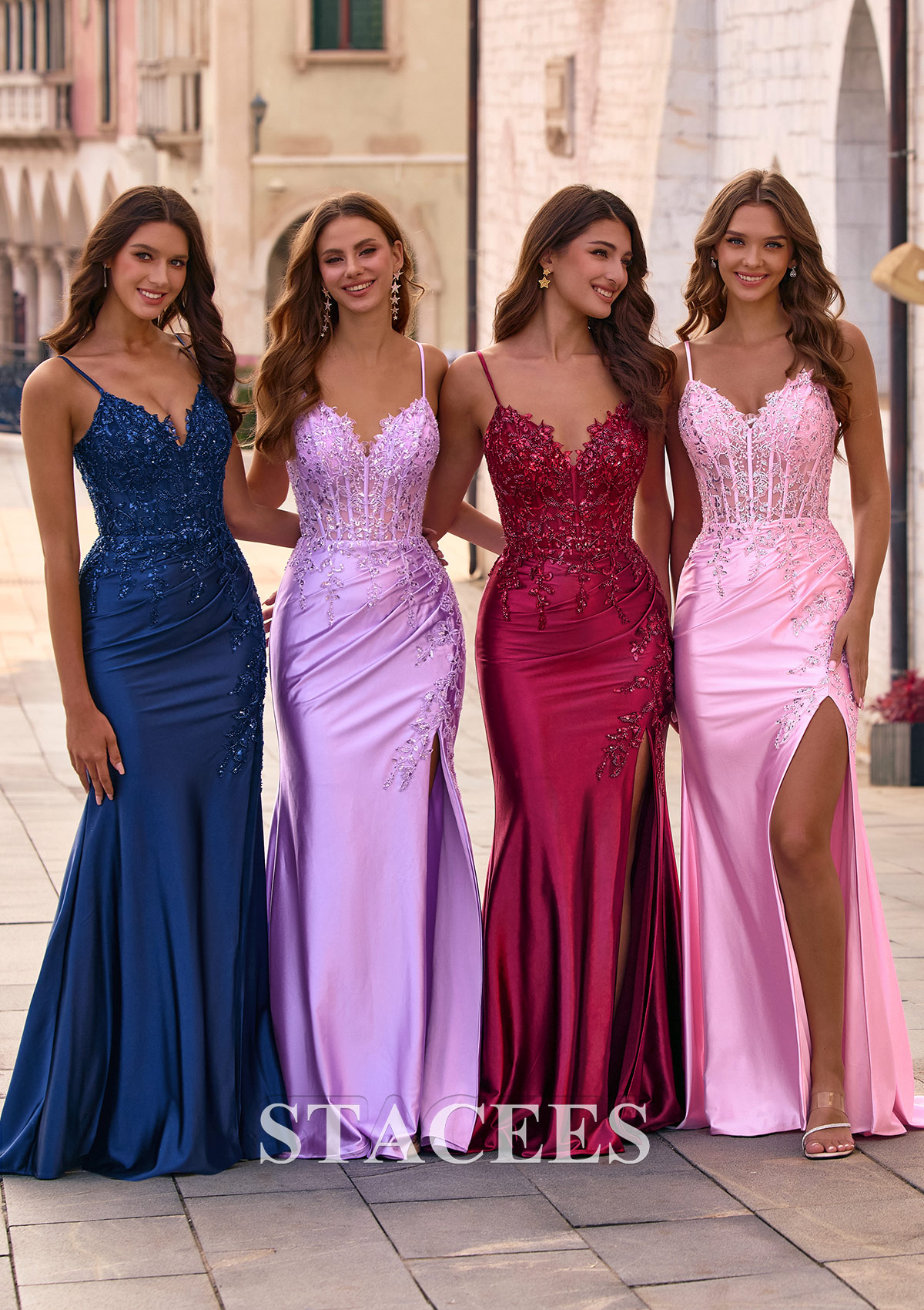 Trumpet/Mermaid Silk like Satin Prom Dress V Neck Sweep Train with Appliqued Beading Pleated Sequins Split S8880P - Prom Dresses - Stacees.co.uk