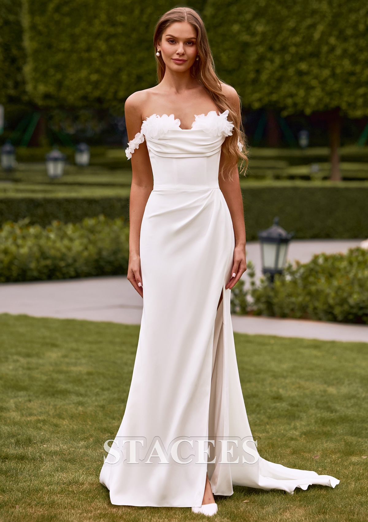 Trumpet/Mermaid Stretch Crepe Wedding Dress Off-the-Shoulder Court Train with Beading Flowers Pleated Split S3159W - Wedding Dresses - Stacees.co.uk