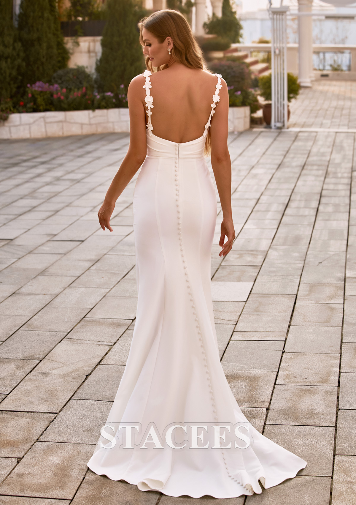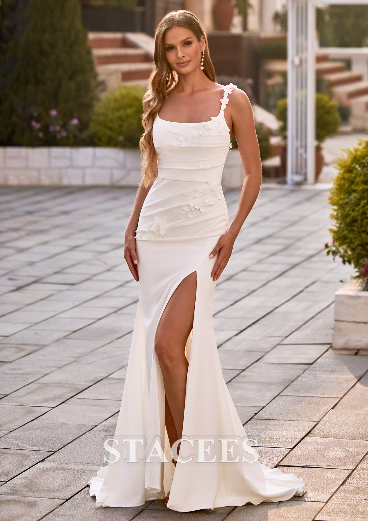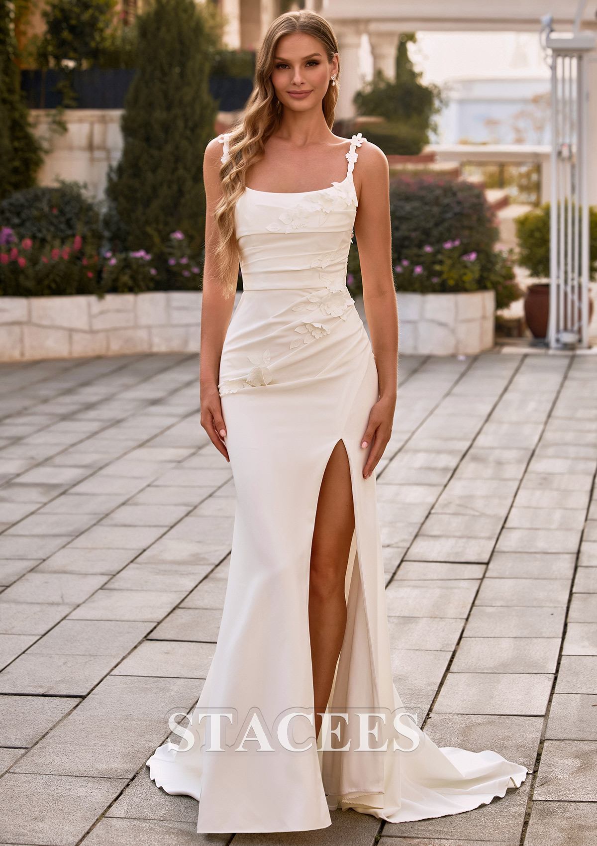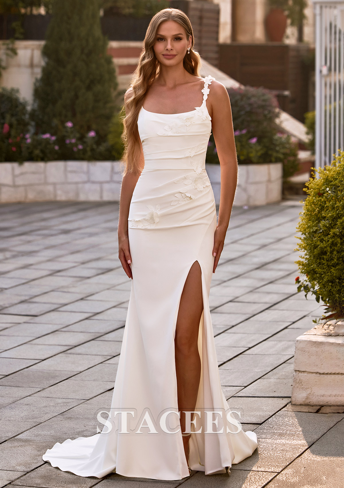 Trumpet/Mermaid Stretch Crepe Wedding Dress Scoop Neck Court Train with Flowers Pleated Split S3119W - Wedding Dresses - Stacees.co.uk