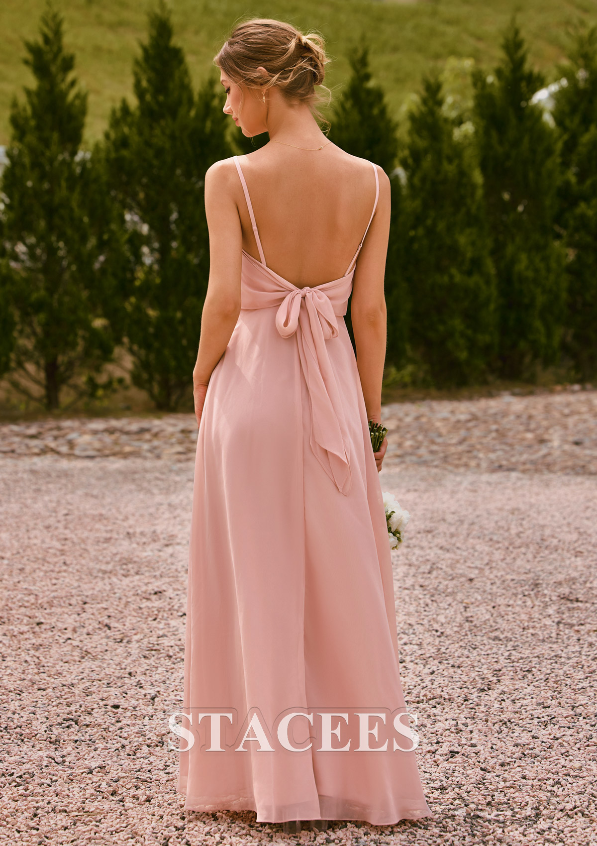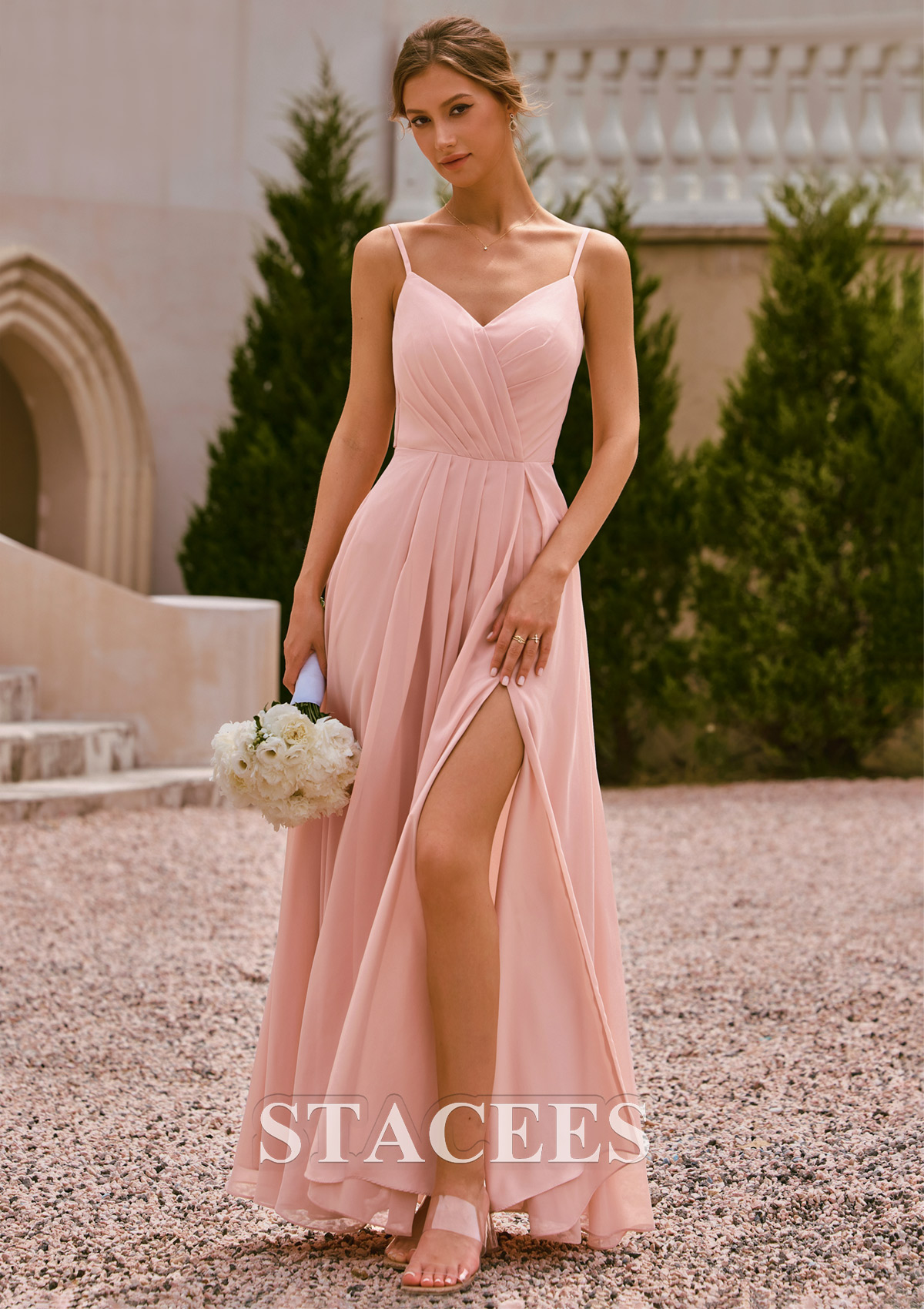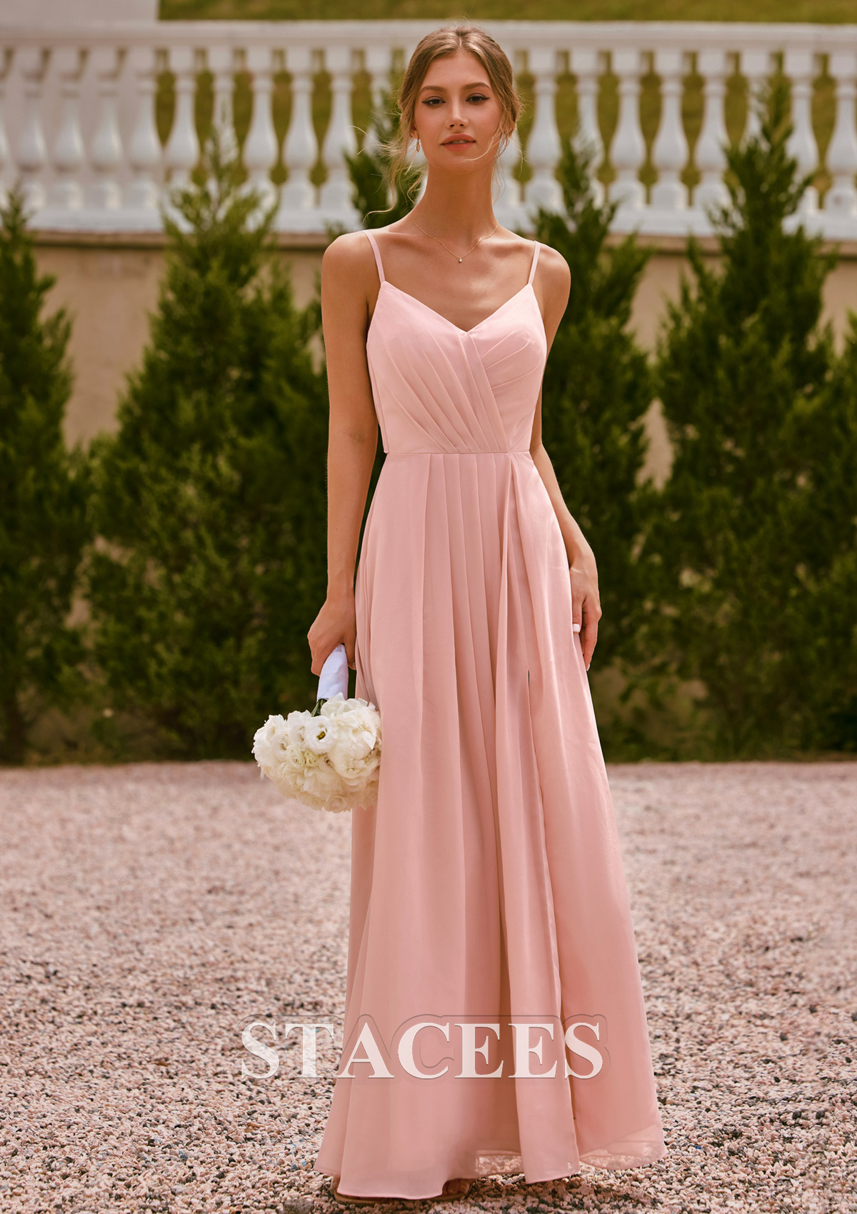 A-line Chiffon Bridesmaid Dress V Neck Floor-Length with Bowknot Pleated Split S6087B - Bridesmaid Dresses - Stacees.co.uk