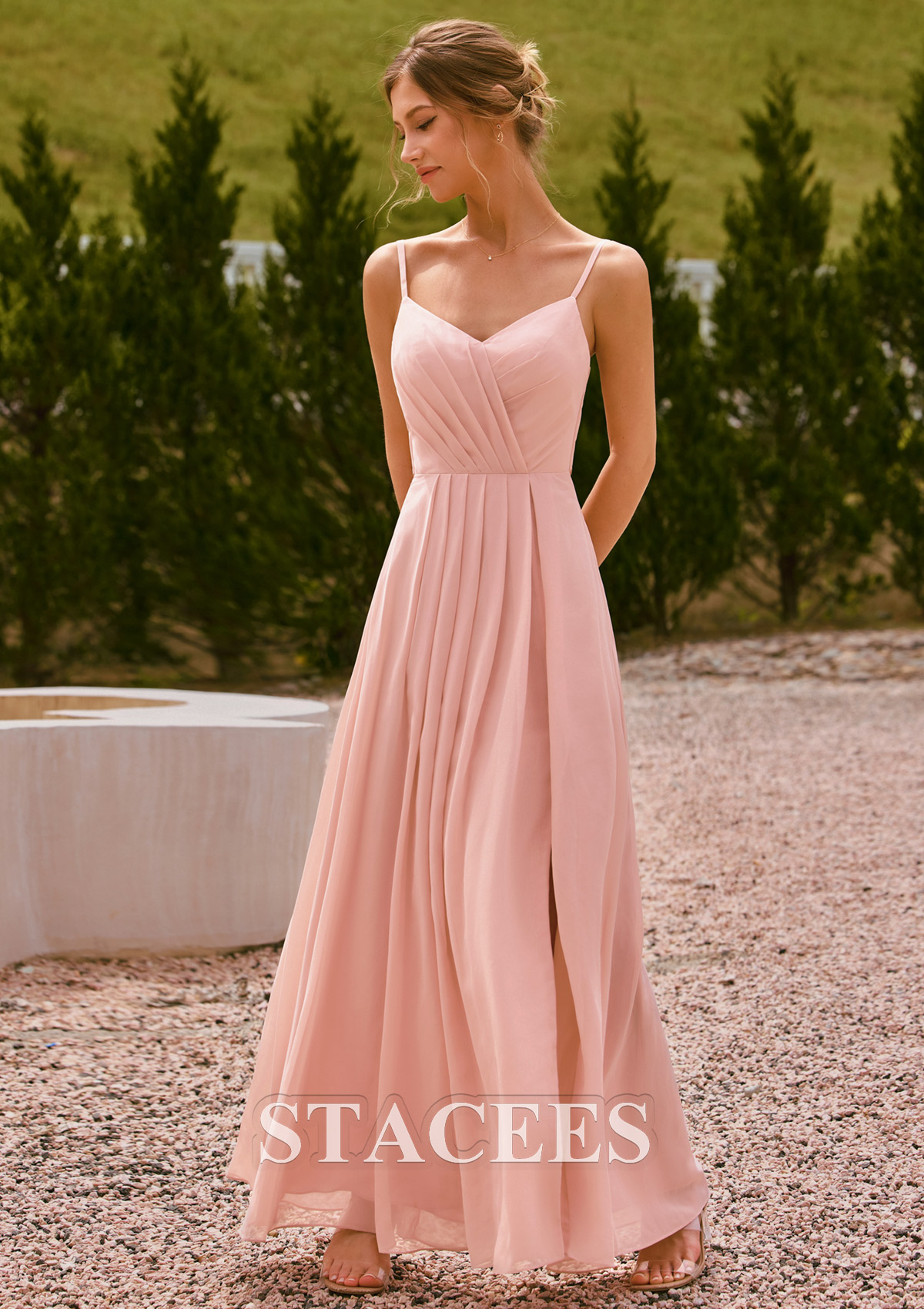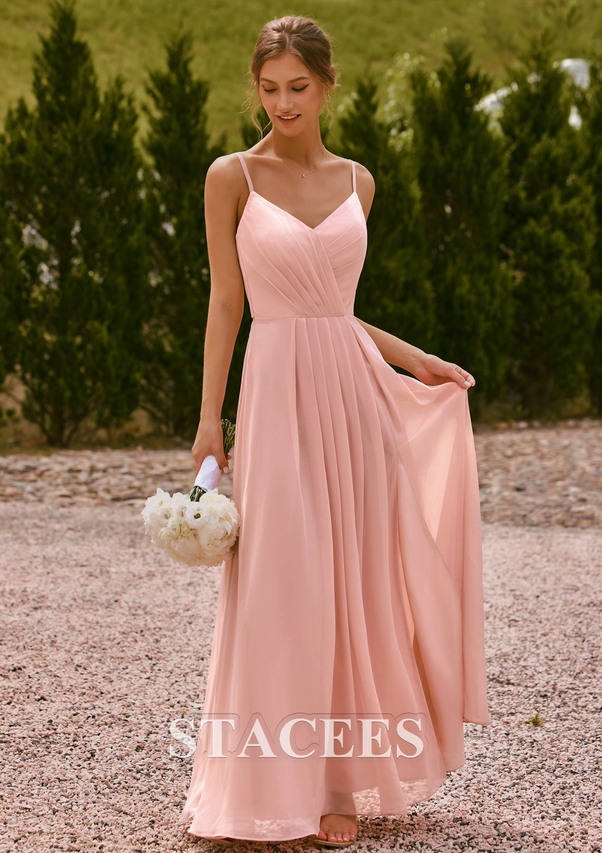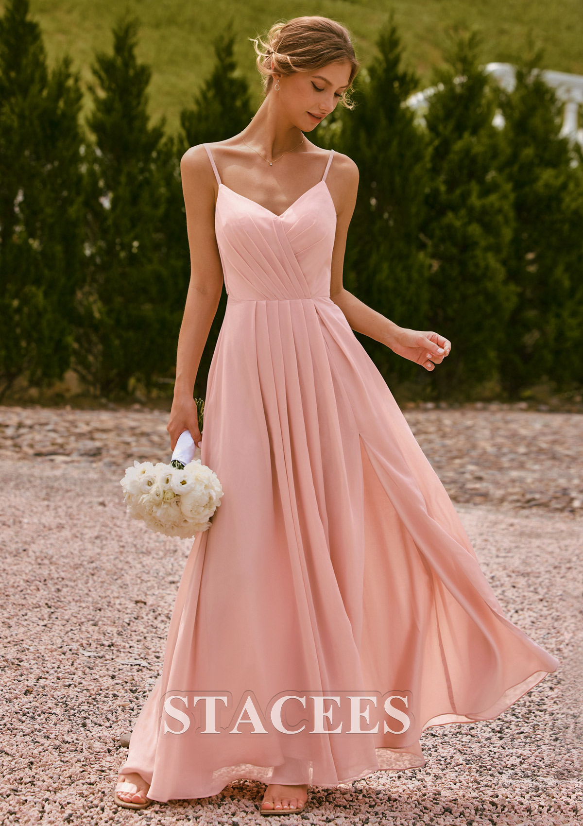 A-line Chiffon Bridesmaid Dress V Neck Floor-Length with Bowknot Pleated Split S6087B - Bridesmaid Dresses - Stacees.co.uk