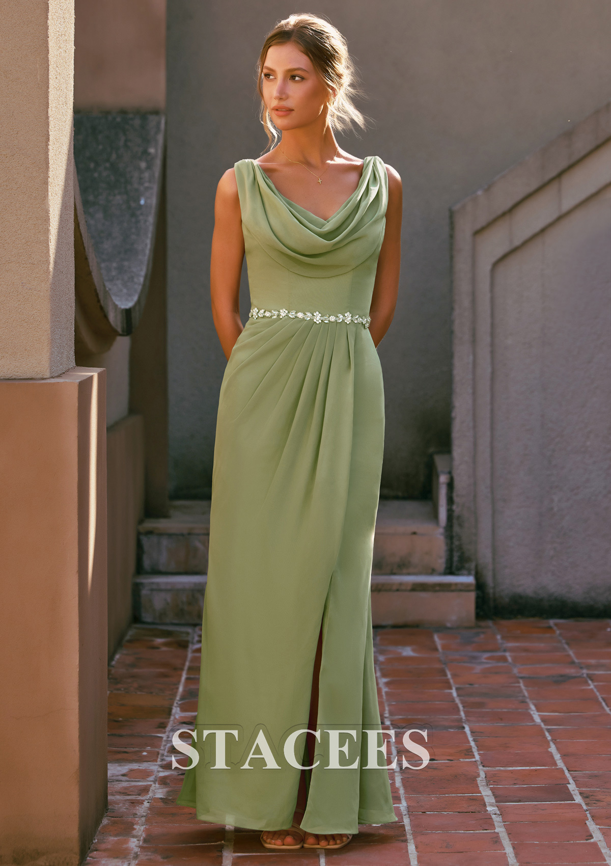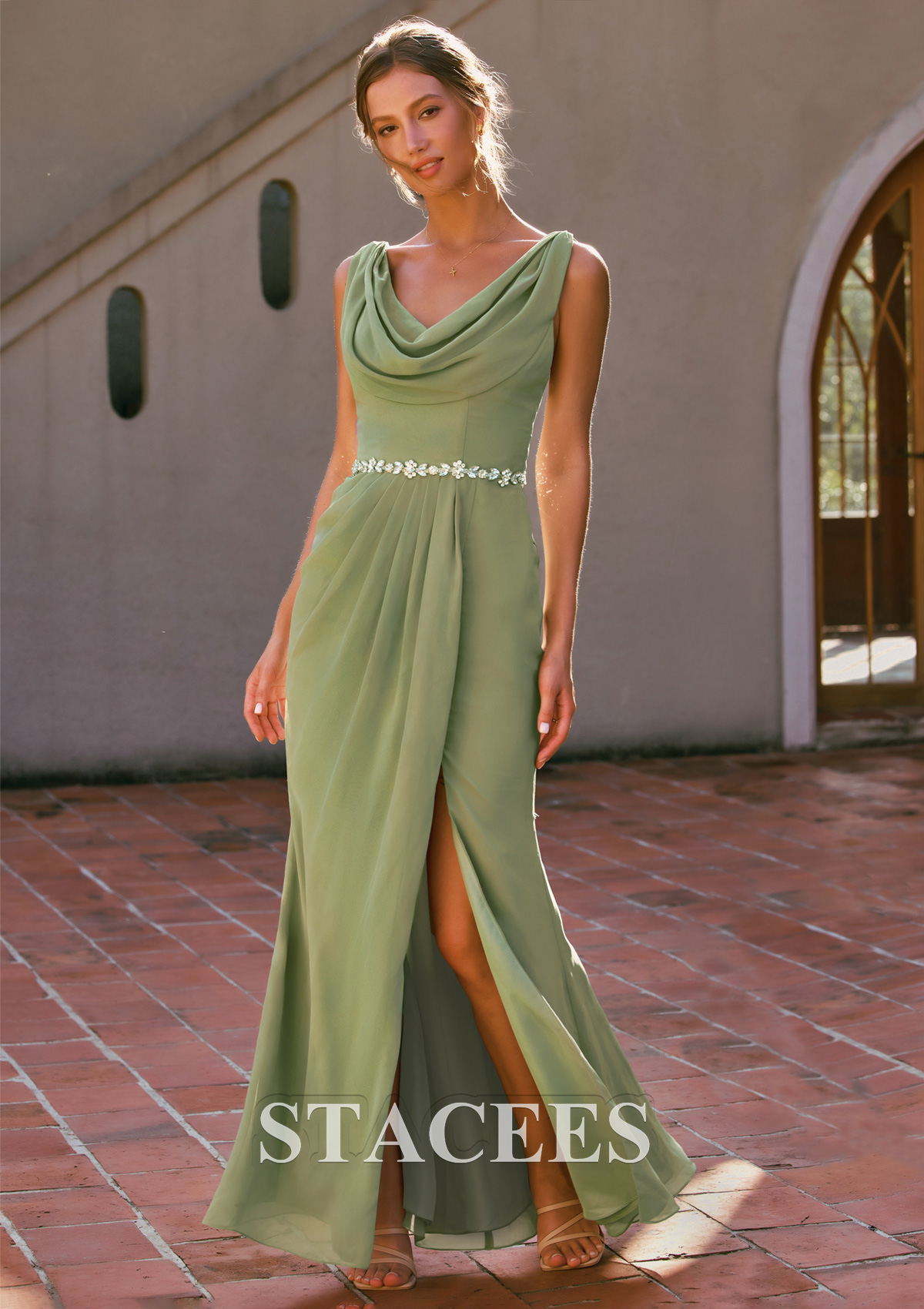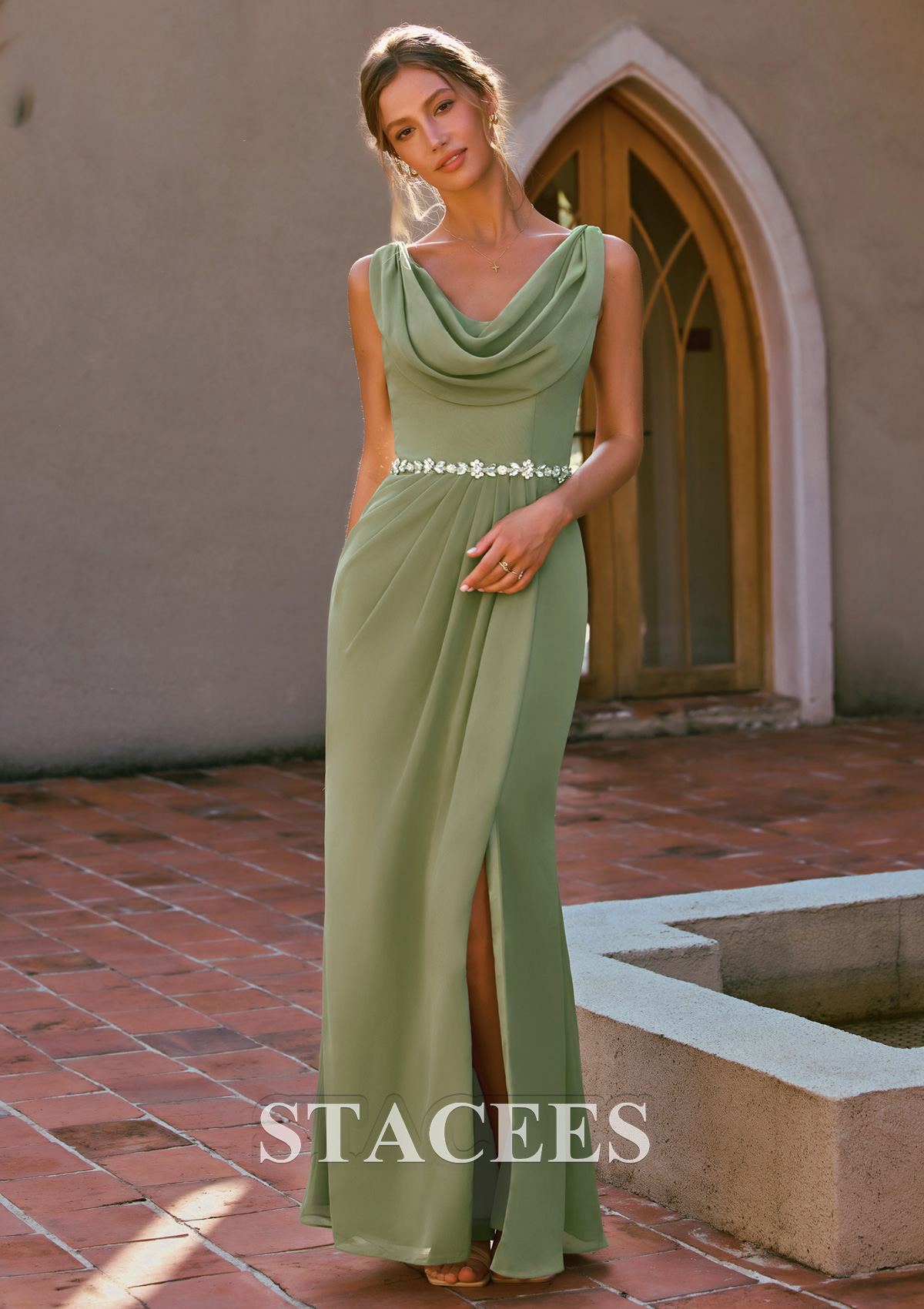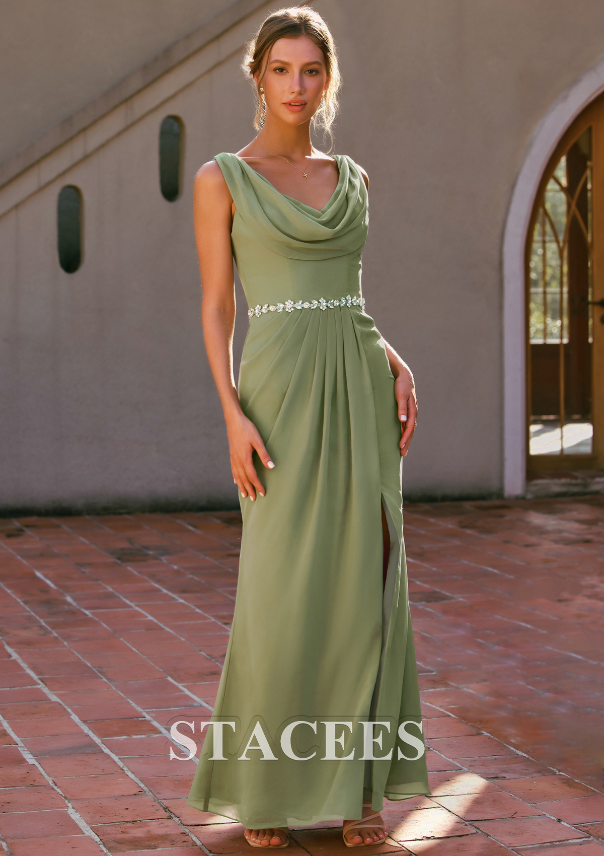 Sheath/Column Chiffon Bridesmaid Dress Cowl Neck Floor-Length with Pleated Sashes Split S6144BA - Bridesmaid Dresses - Stacees.co.uk