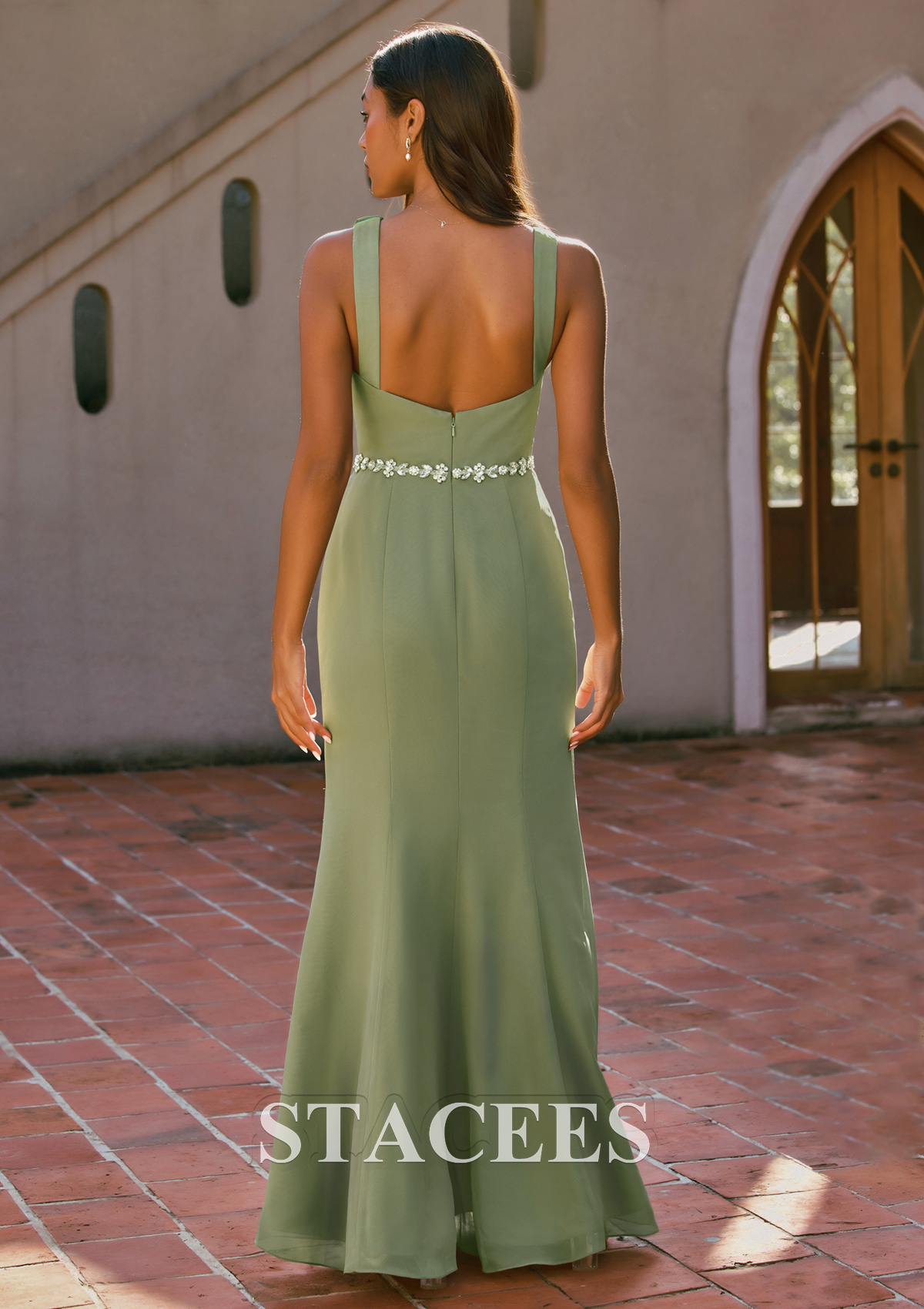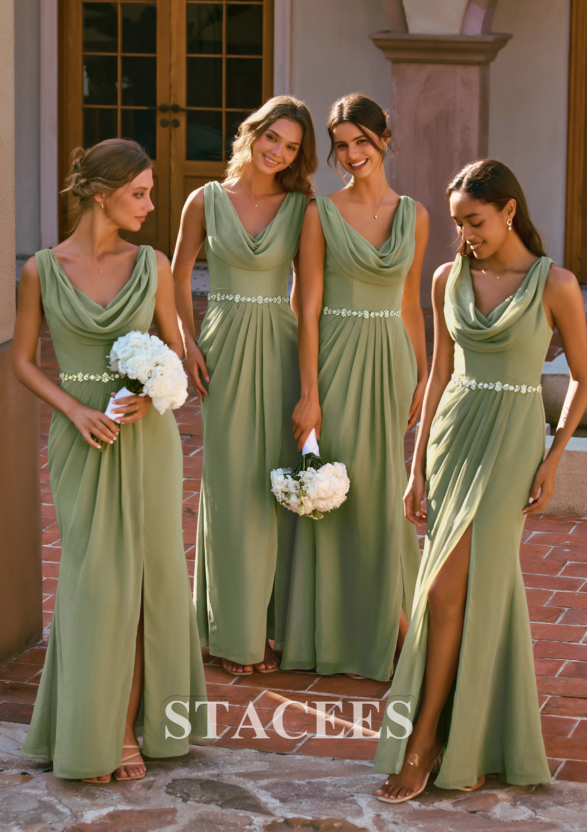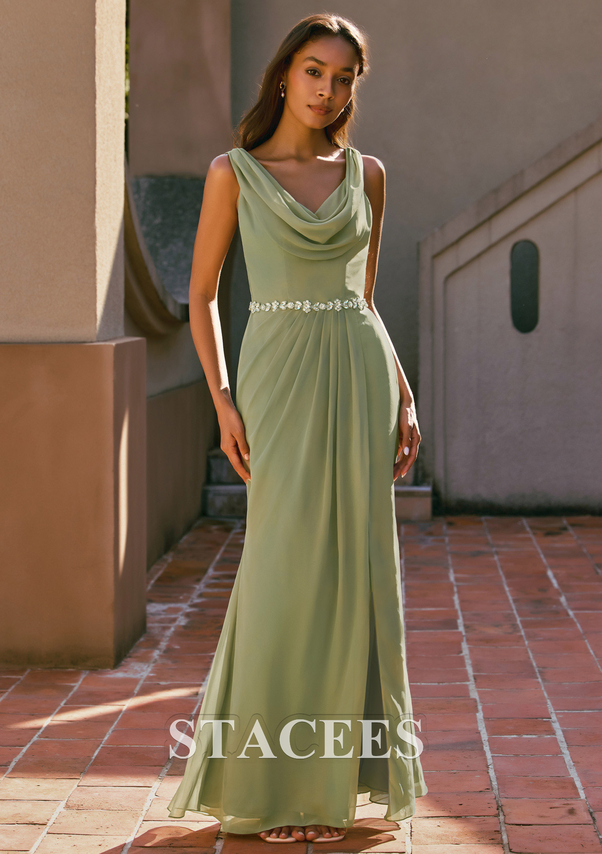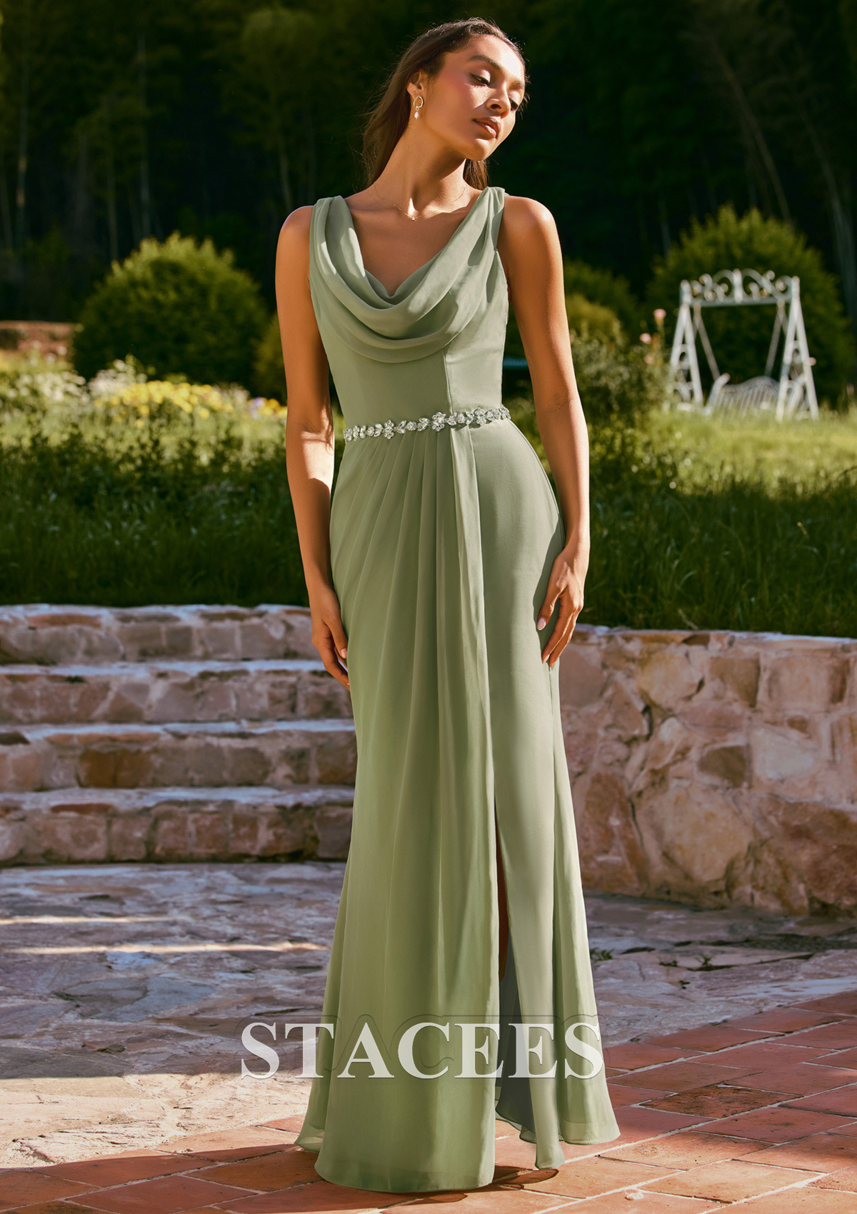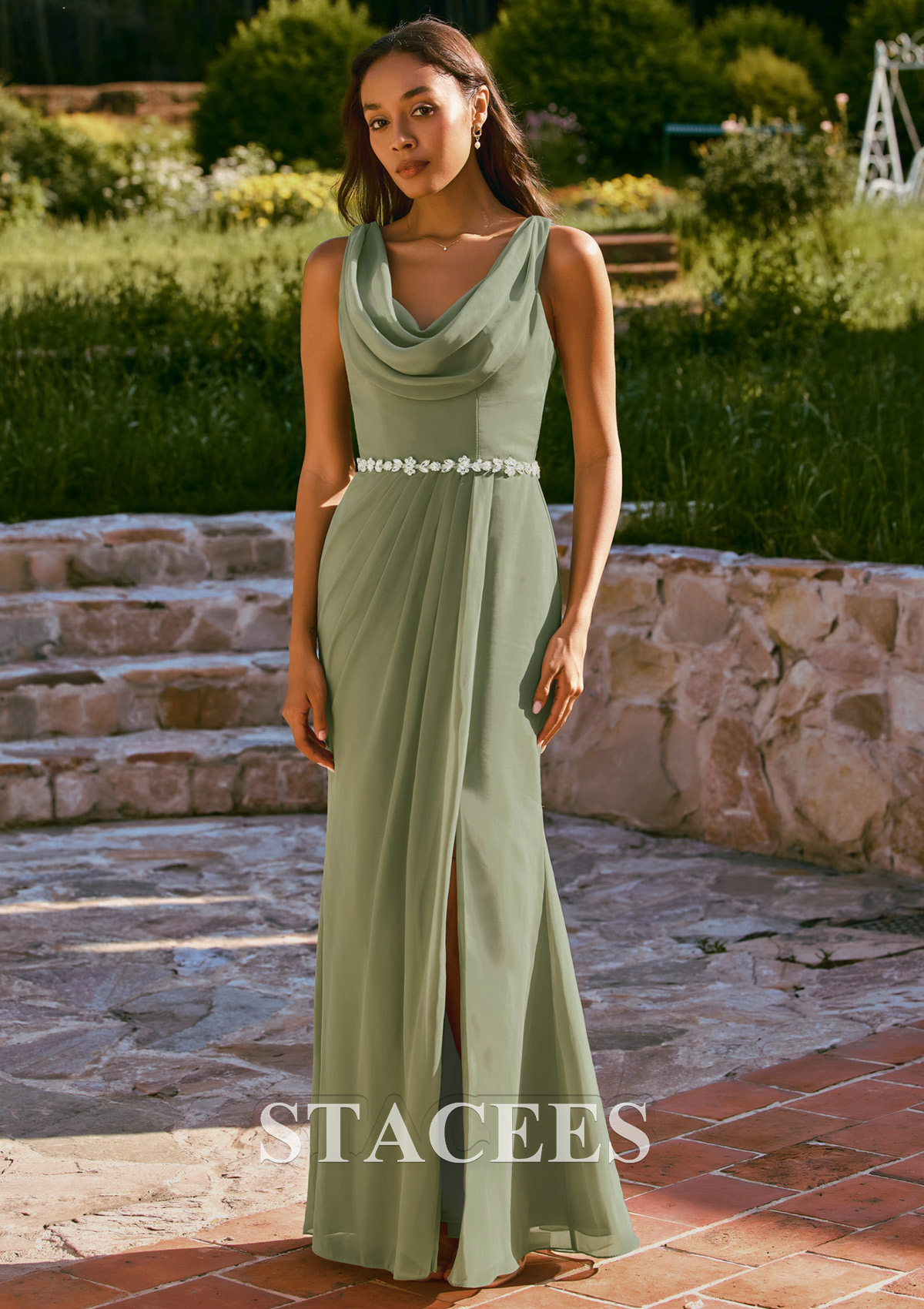Sheath/Column Chiffon Bridesmaid Dress Cowl Neck Floor-Length with Pleated Sashes Split S6144BL - Bridesmaid Dresses - Stacees.co.uk